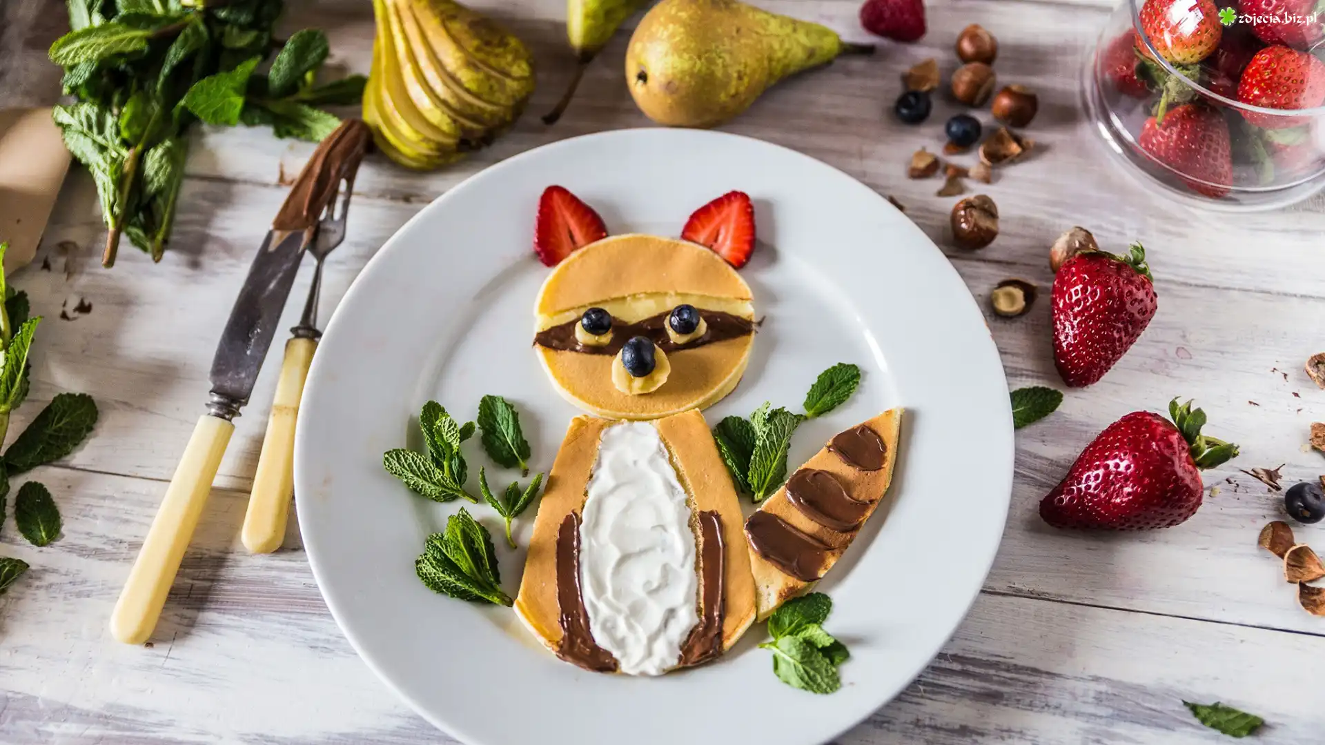Zdjęcie Naleśnik, Szop, Placek, Truskawki, Nóż, Talerz