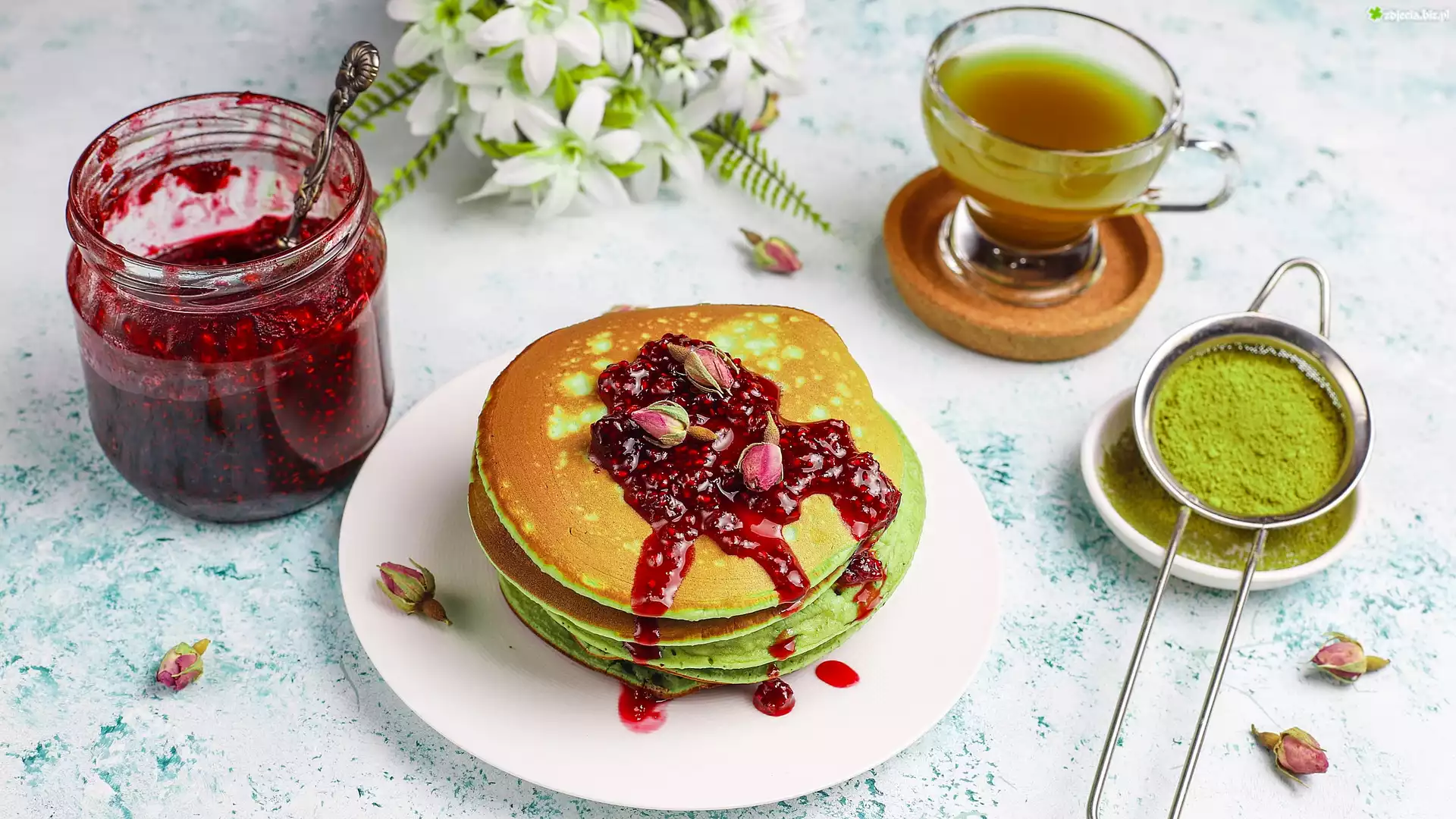 Zdjęcie Naleśniki, Dżem, Herbata, Pąki, Róż