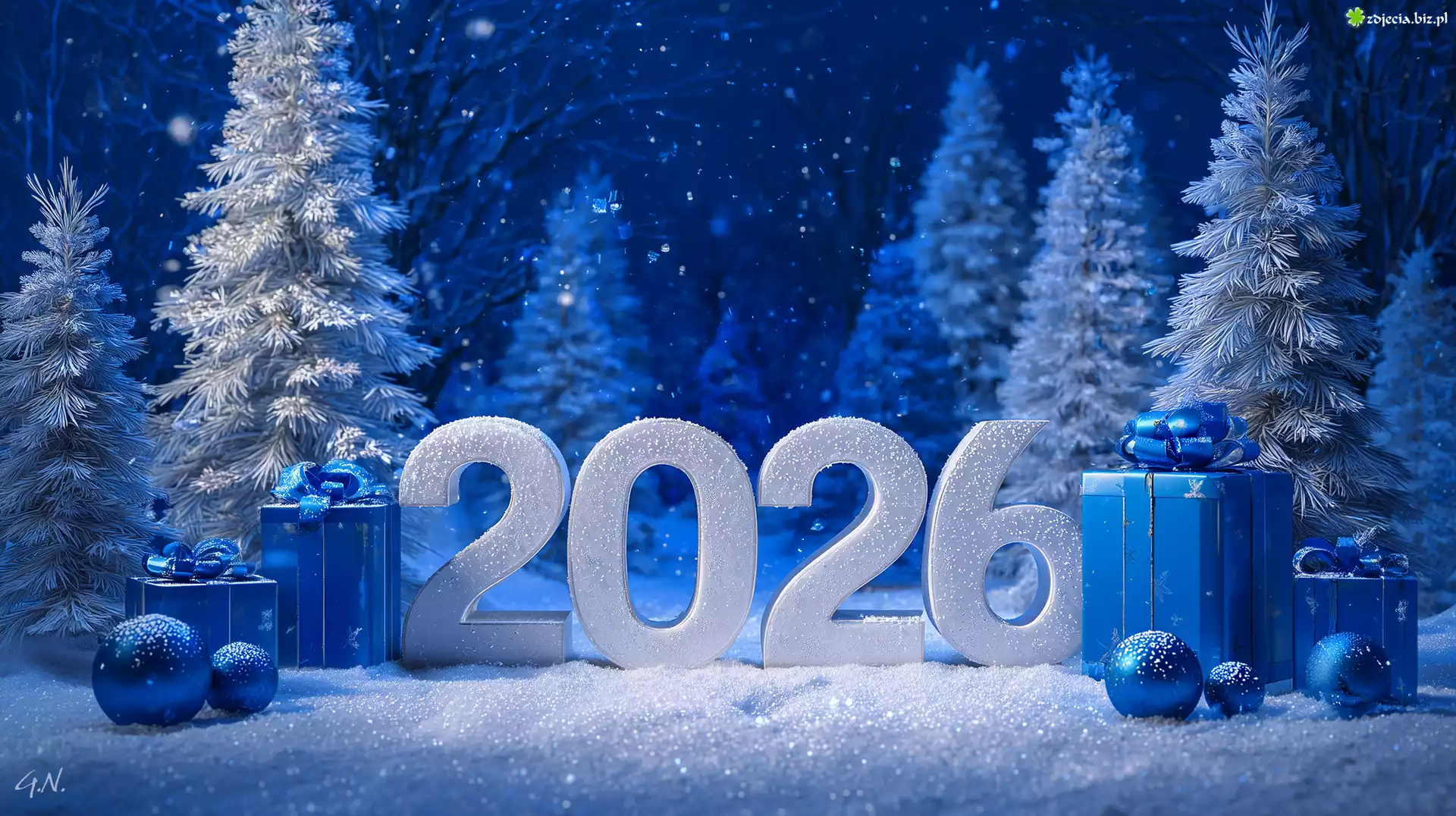 Zdjęcie, Napis, Nowy Rok, 2026, Prezenty, Choinki, Bombki, Zima, Grafika Ai