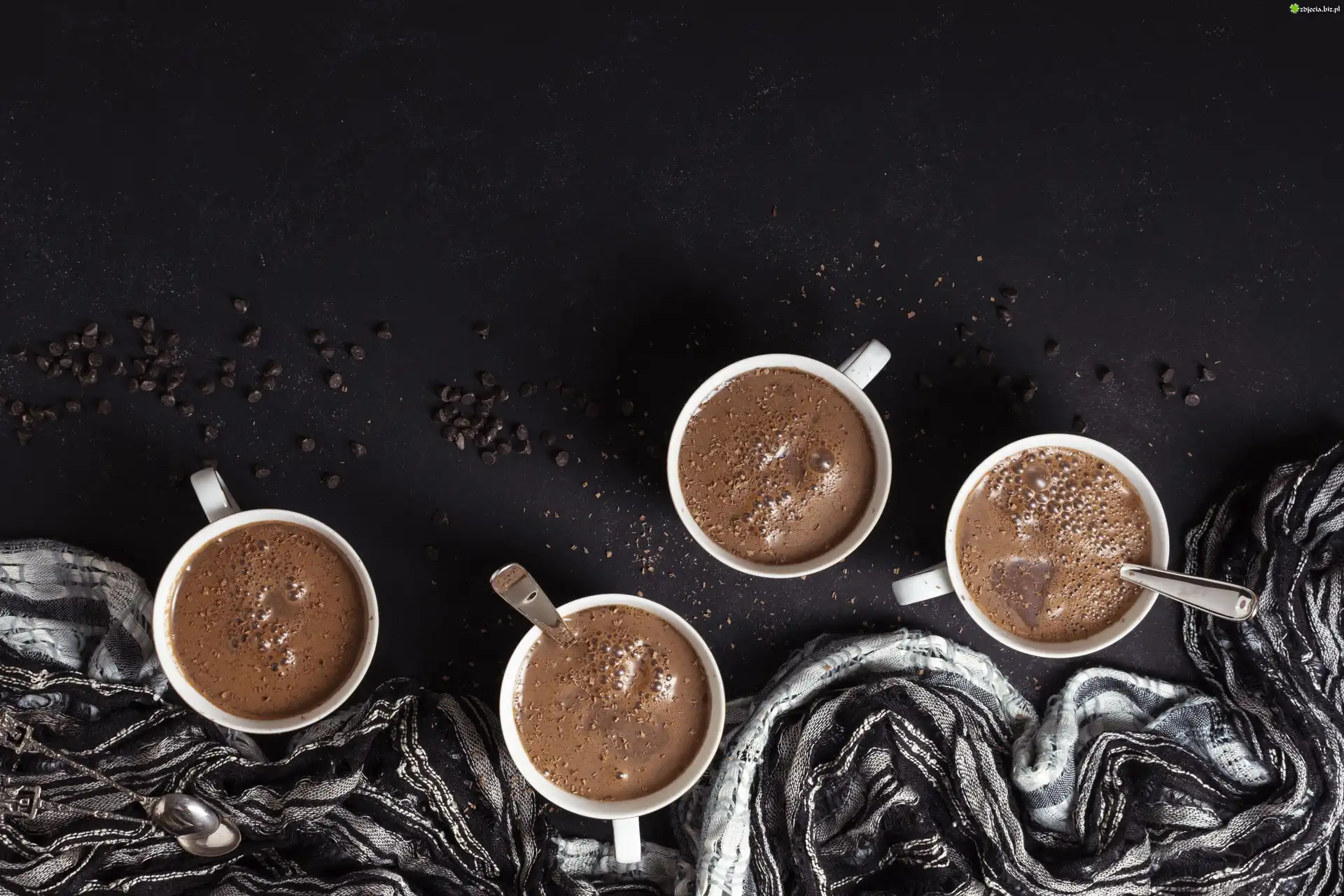 Zdjęcie, Napój, Czekolada, Filiżanki, Łyżeczki, Tło, Ciemne