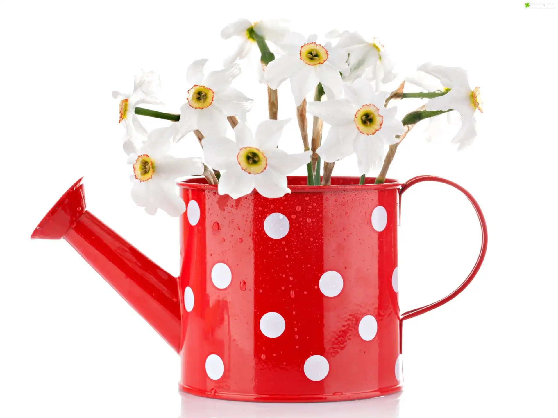 Zdjęcie Narcyze, Czerwona, Konewka, Białe, Groszki