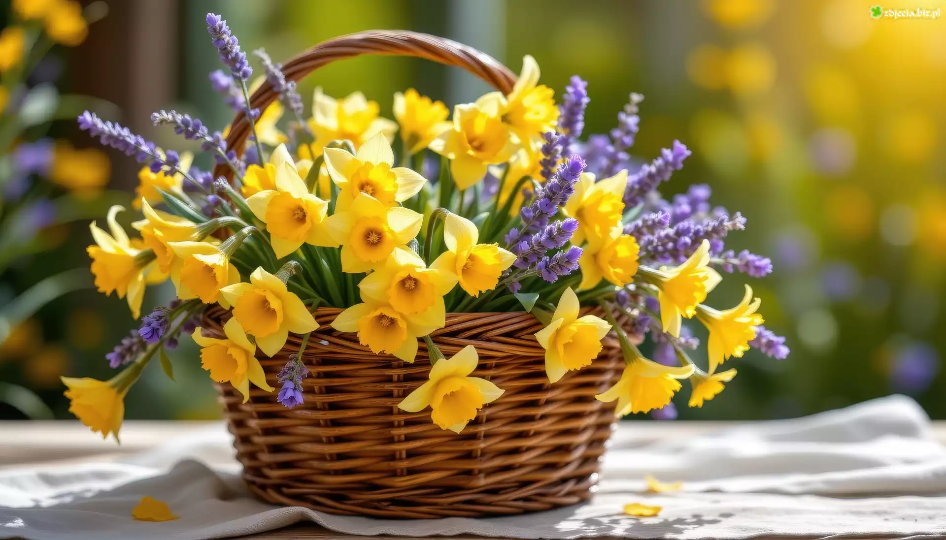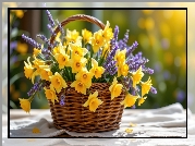 Zdjęcie Wiklinowy, Koszyk, Kwiaty, Narcyzy żonkile, Lawenda