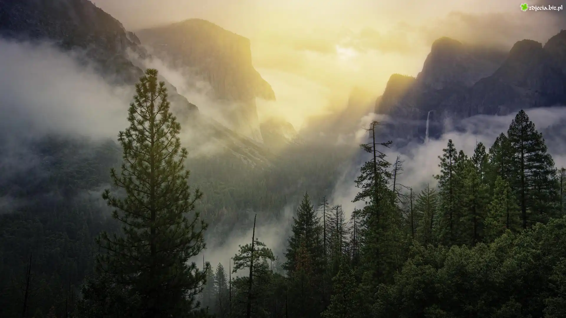 Zdjęcie Dolina, Yosemite Valley, Park Narodowy Yosemite, Mgła, Góry, Drzewa, Lasy, Stan Kalifornia, Stany Zjednoczone |