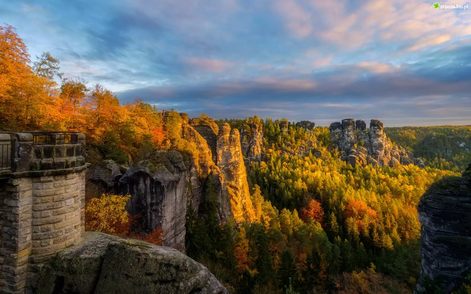 Zdjęcie Niemcy, Saksonia, Park Narodowy Saskiej Szwajcarii, Góry Połabskie, Las, Drzewa, Skały, Jesień, Chmury |