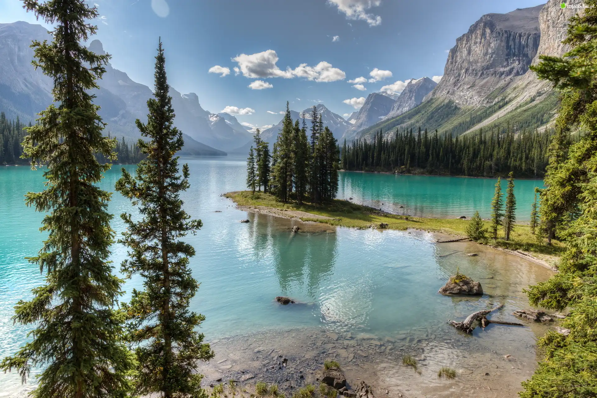 Zdjęcie, Kanada, Park Narodowy Jasper, Góry, Jezioro Maligne, Wyspa Ducha, Drzewa, Chmury