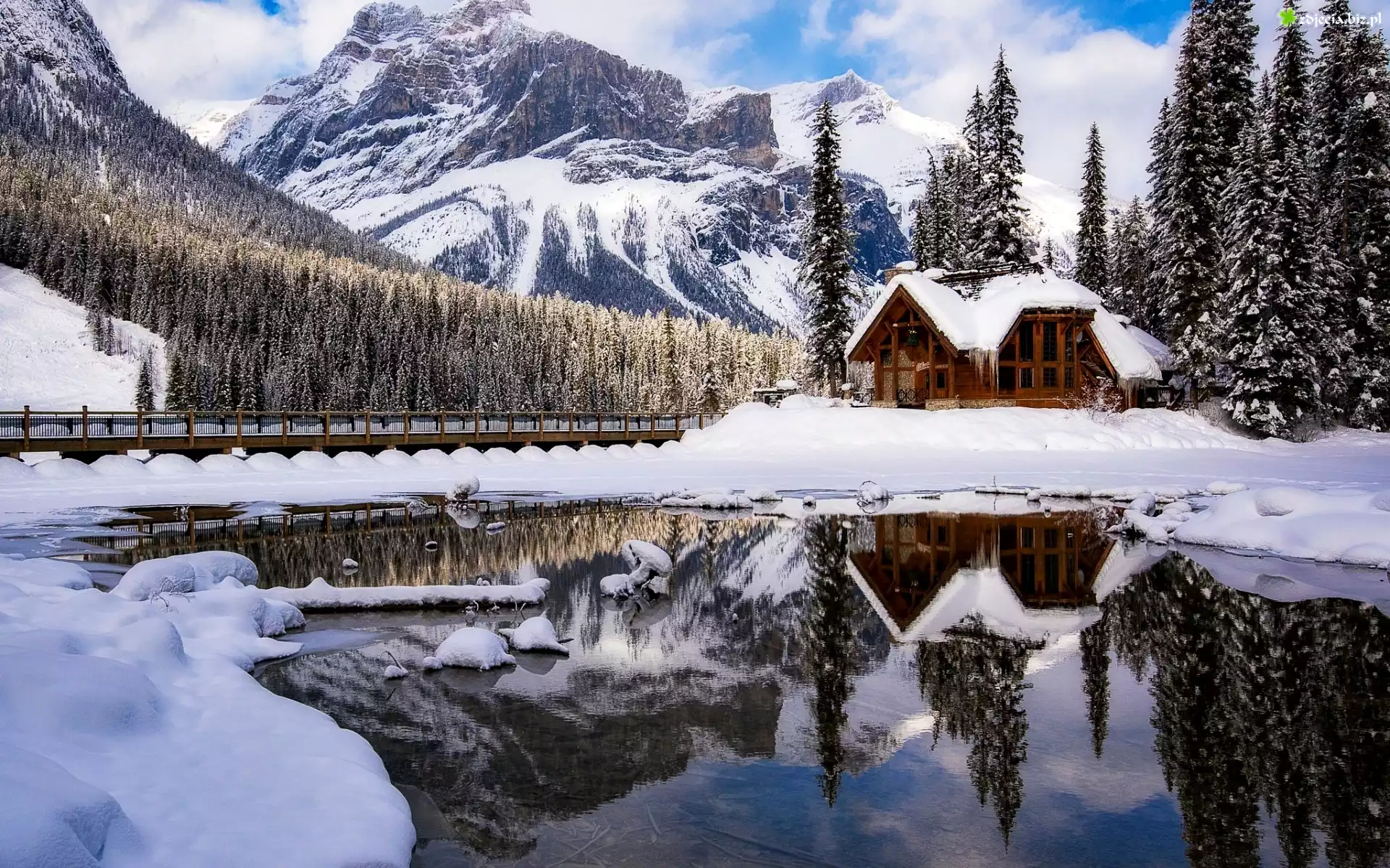 Zdjęcie Kanada, Park Narodowy Yoho, Góry, Jezioro Emerald, Most, Drzewa, Dom, Zima