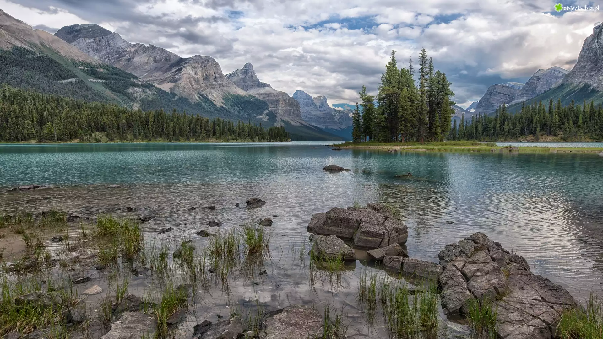 Zdjęcie Kanada, Park Narodowy Jasper, Jezioro Maligne, Wyspa Ducha, Góry, Chmury, Drzewa