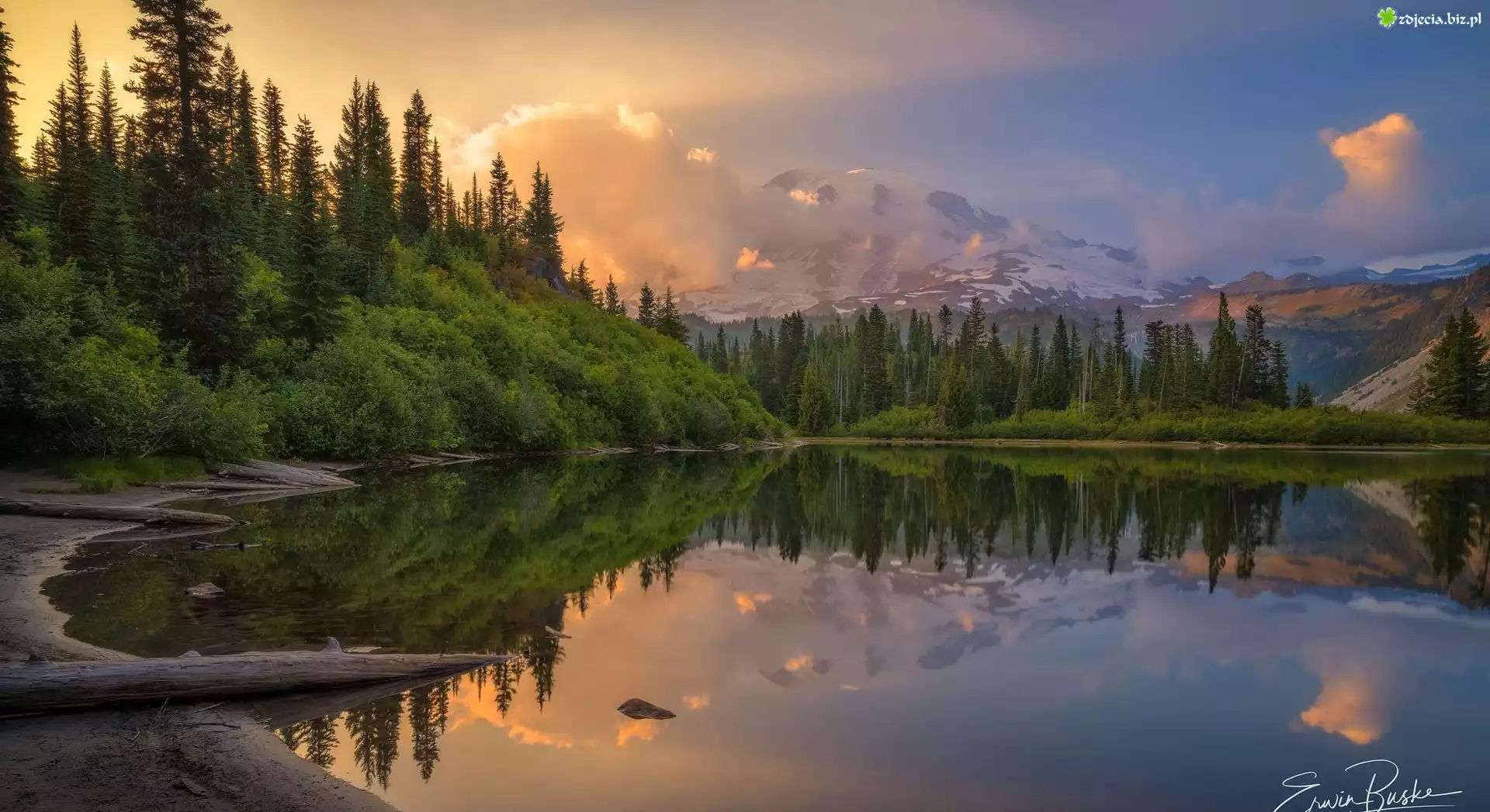 Zdjęcie Jezioro, Góry, Drzewa, Las, Park Narodowy Mount Rainier, Stan Waszyngton, Stany Zjednoczone |