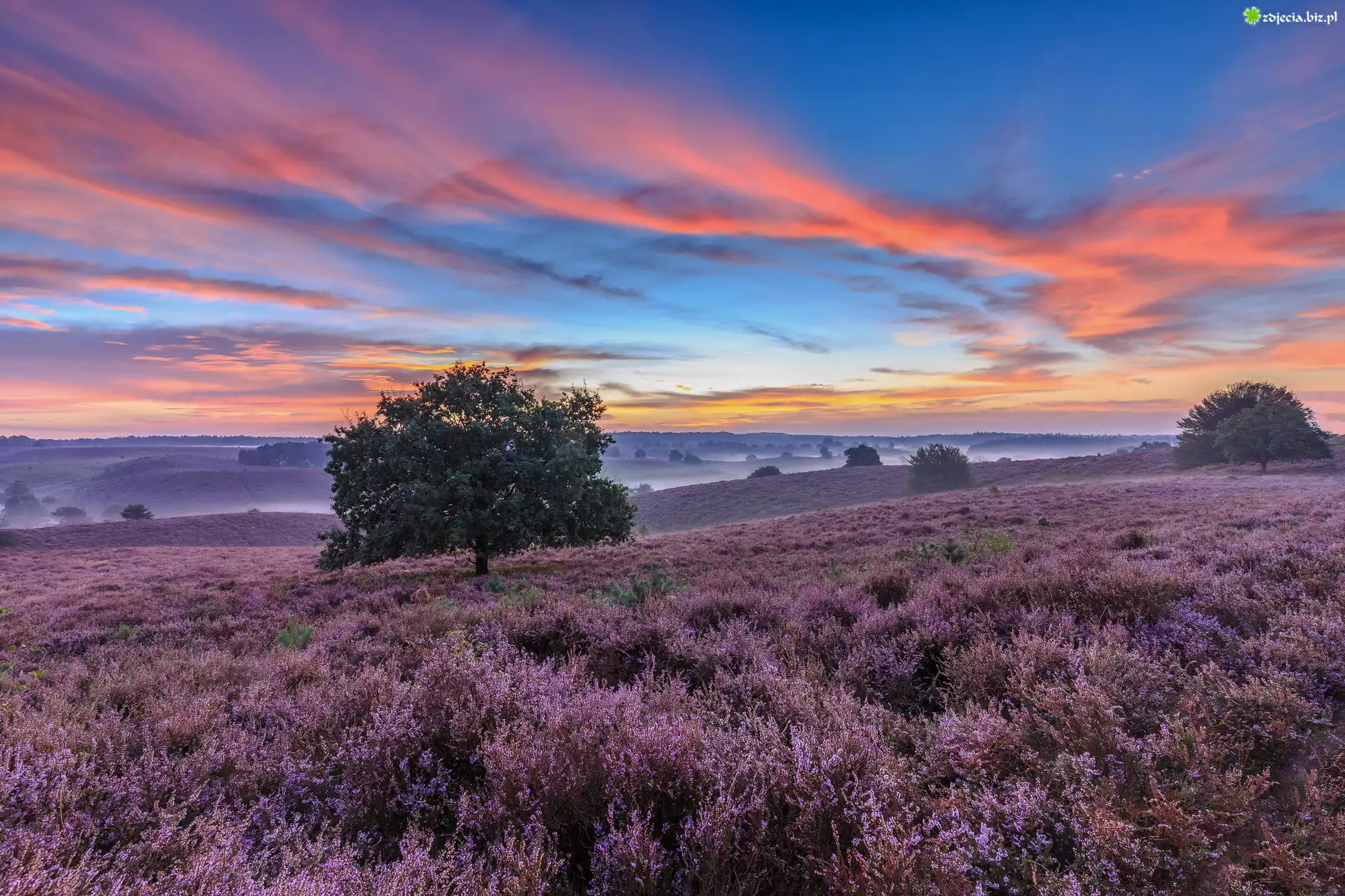 Zdjęcie Wrzosowisko, Park Narodowy Veluwezoom, Prowincja Geldria, Holandia, Wrzosy, Mgła, Drzewa, Chmury |