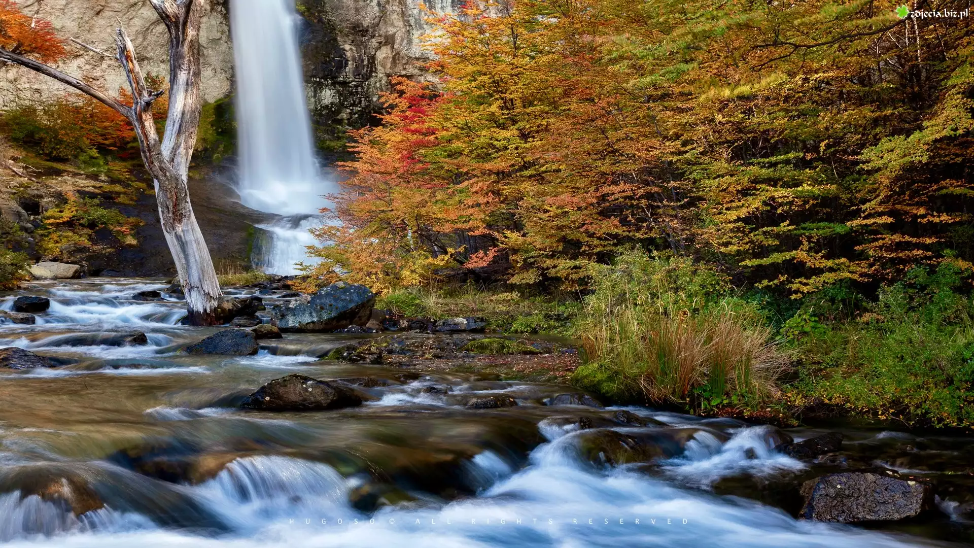 Zdjęcie Argentyna, Patagonia, Skały, Wodospad, Salto do Chorrillo, Park Narodowy Los Glaciares, Rzeka, Jesień, Drzewa |