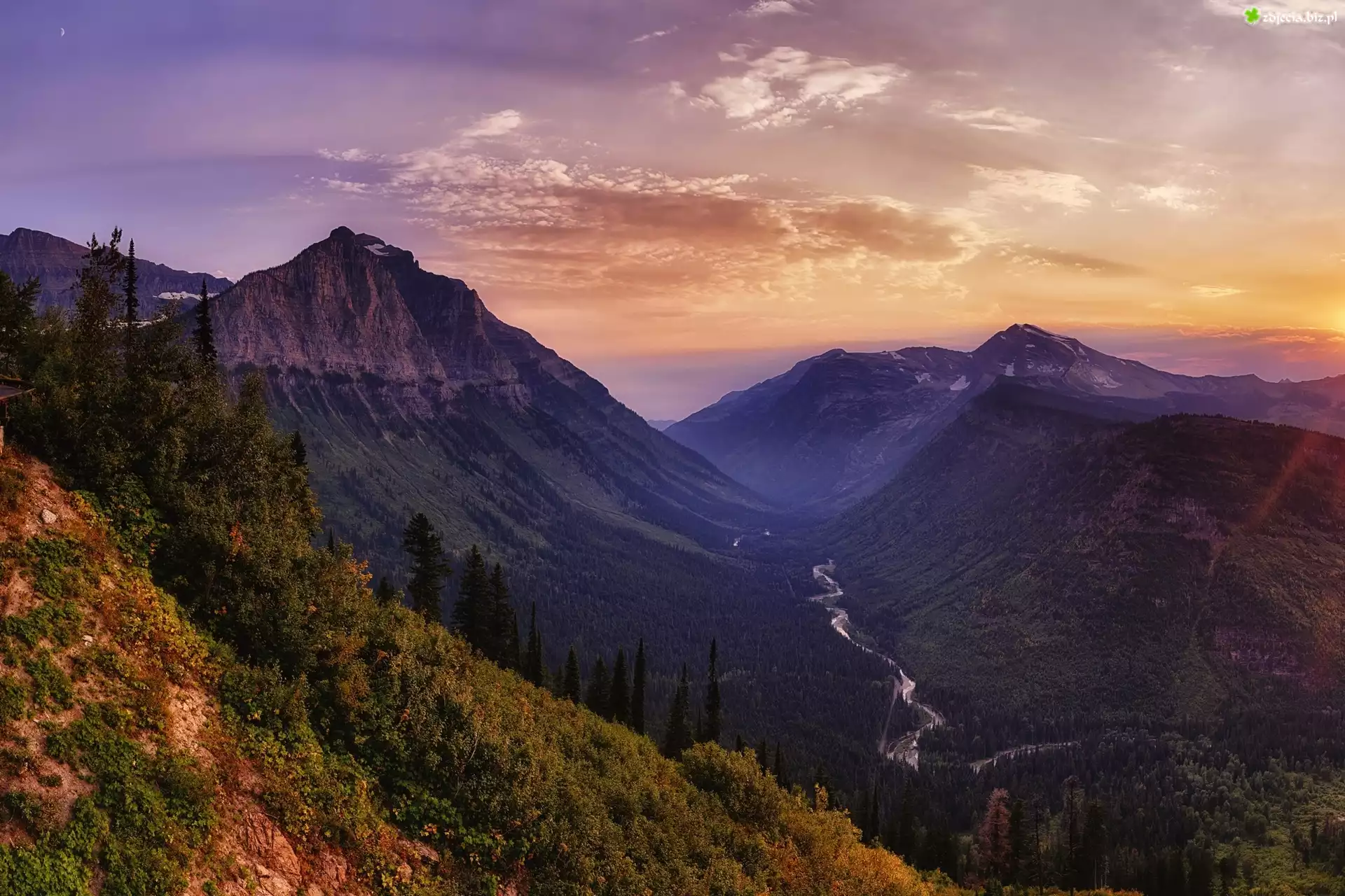 Zdjęcie, Stany Zjednoczone, Stan Montana, Park Narodowy Glacier, Góry, Rzeka, Las, Zachód słońca