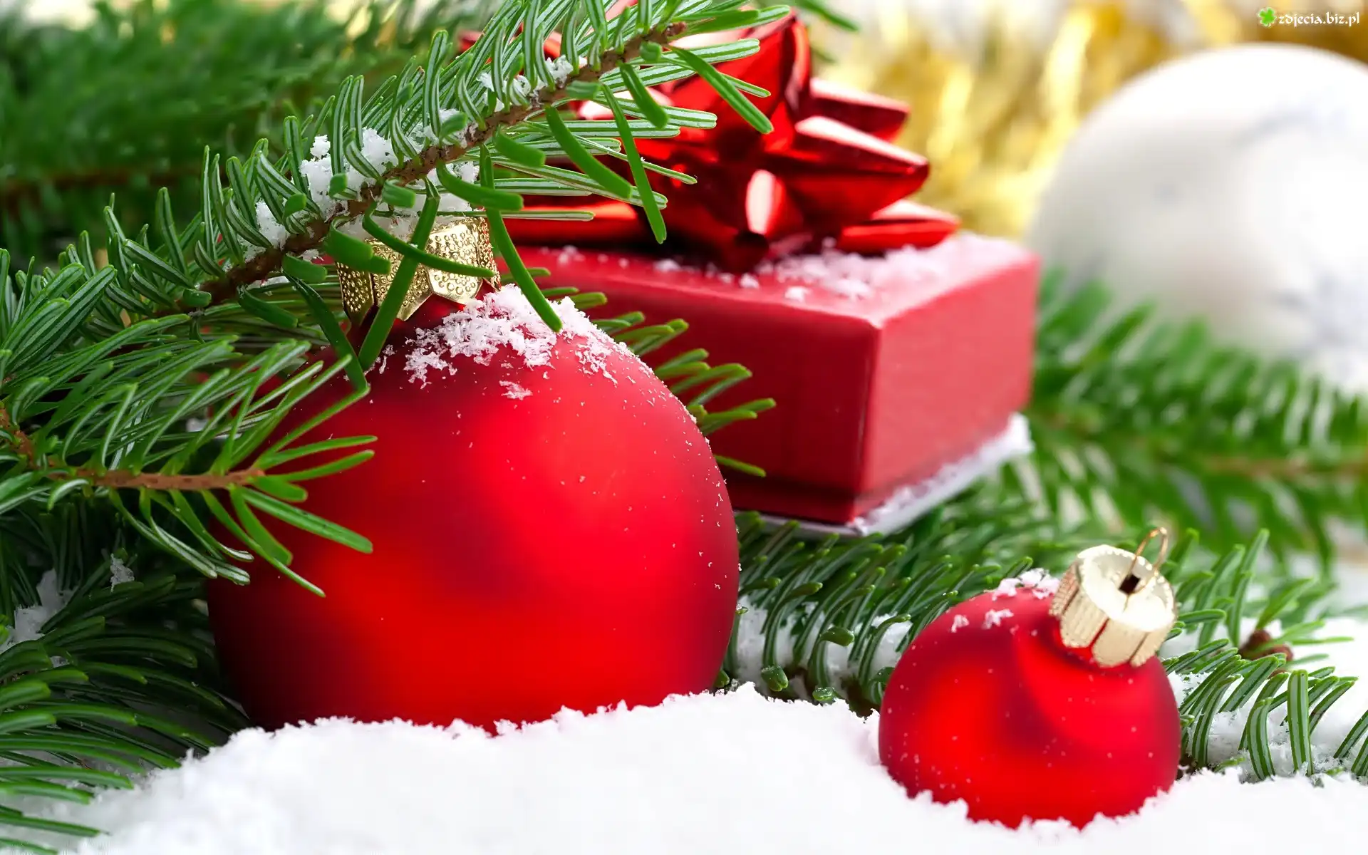 Zdjęcie Boże Narodzenie, Bombki, Prezent, Śnieg, Świerkowe, Gałązki