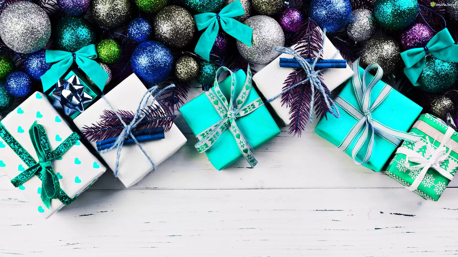 Zdjęcie Boże Narodzenie, Prezenty, Bombki, Świerkowe, Gałązki, Kokardki