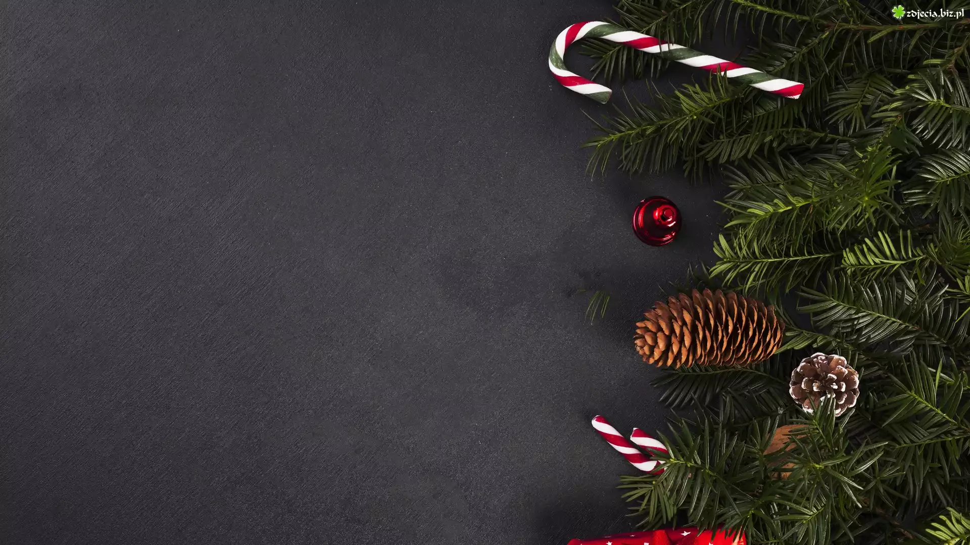 Zdjęcie Boże Narodzenie, Gałązki, Szyszki, Czerwona, Bombka, Lizaki