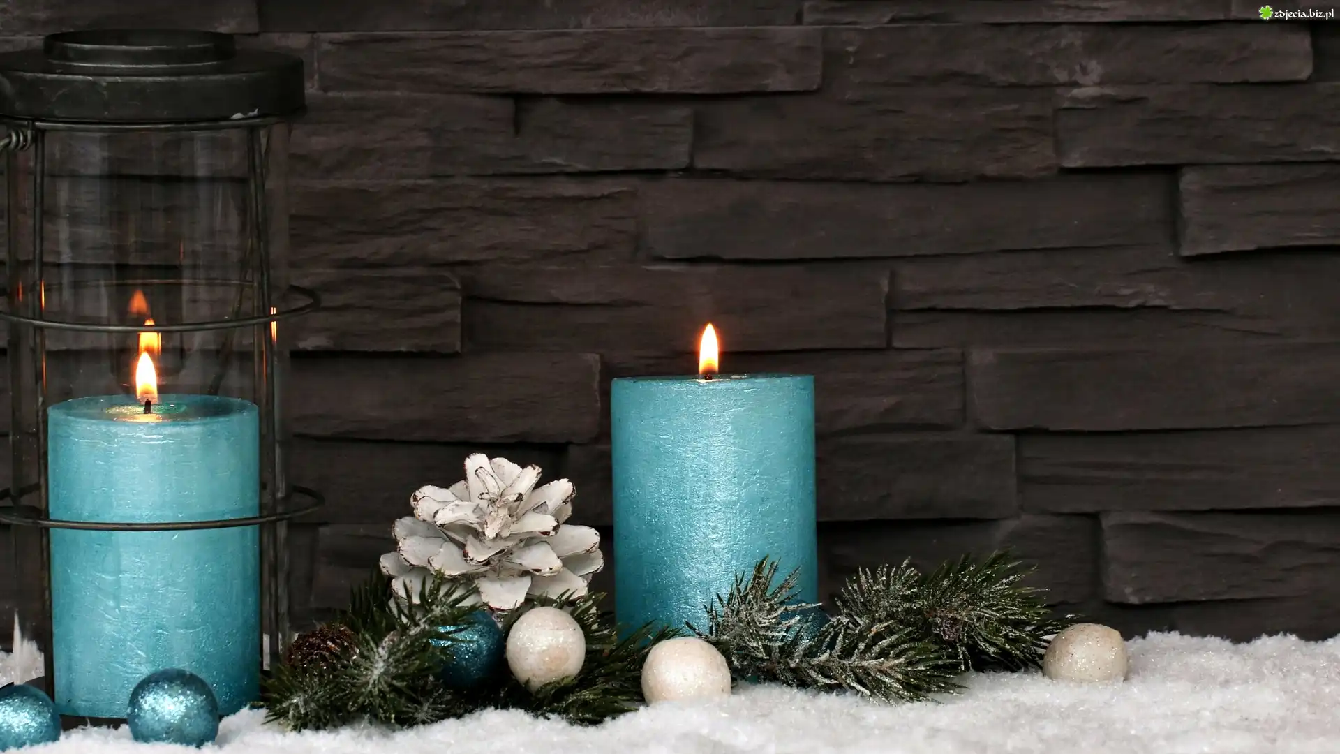 Zdjęcie, Boże Narodzenie, Niebieskie, Świece, Gałązki, Bombki, Szyszka