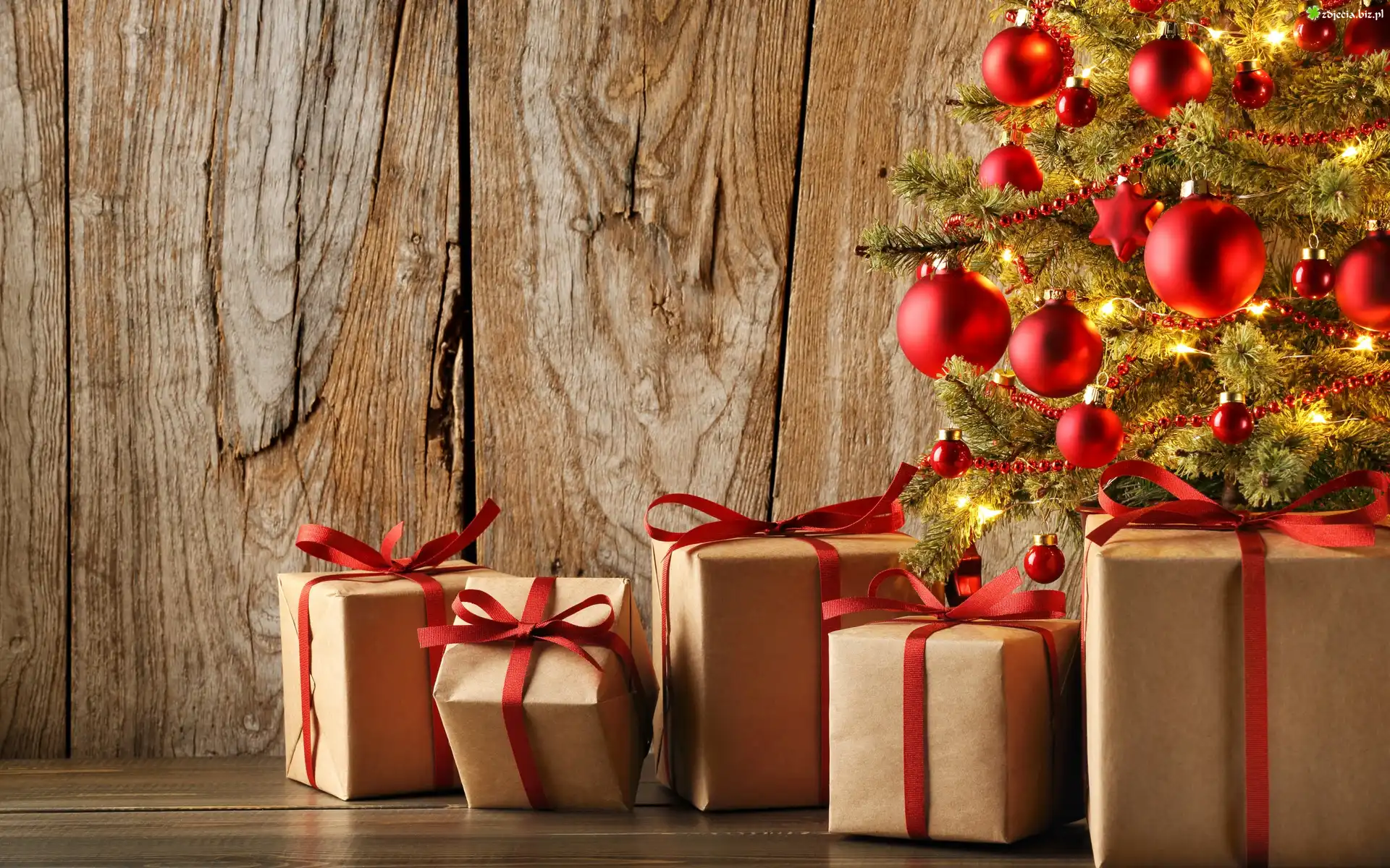 Zdjęcie Boże Narodzenie, Czerwone, Bombki, Świąteczne, Prezenty, Deski, Choinka