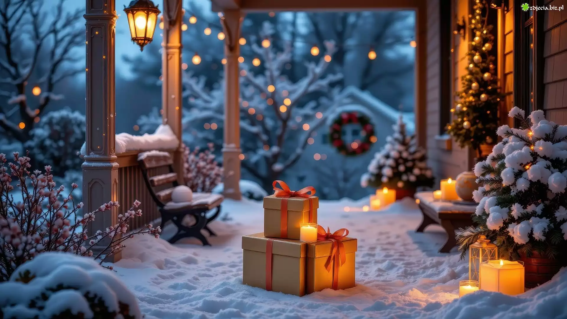 Zdjęcie Zima, Śnieg, Ławki, Prezenty, Lampiony, Krzewy, Boże Narodzenie