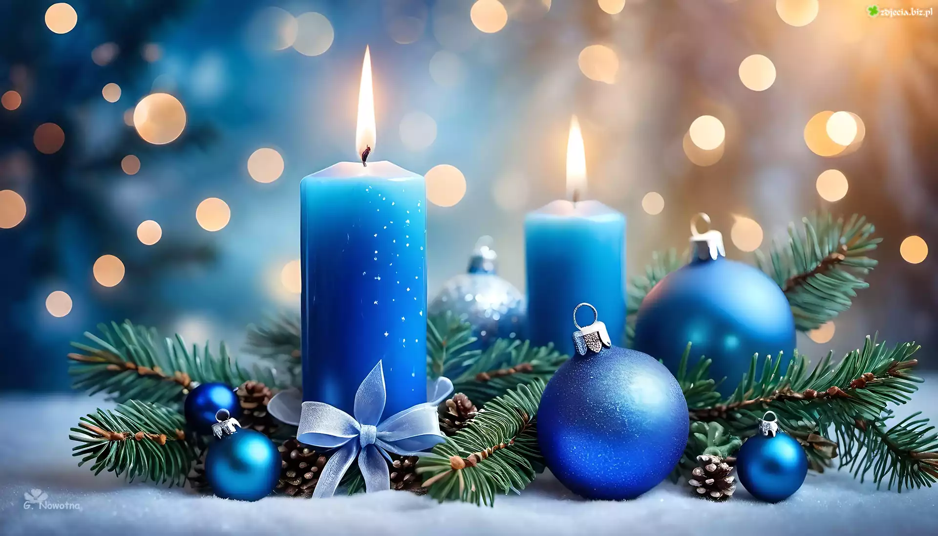 Zdjęcie Niebieski, Stroik, Świece, Bombki, Świerk, Grafika, Boże Narodzenie