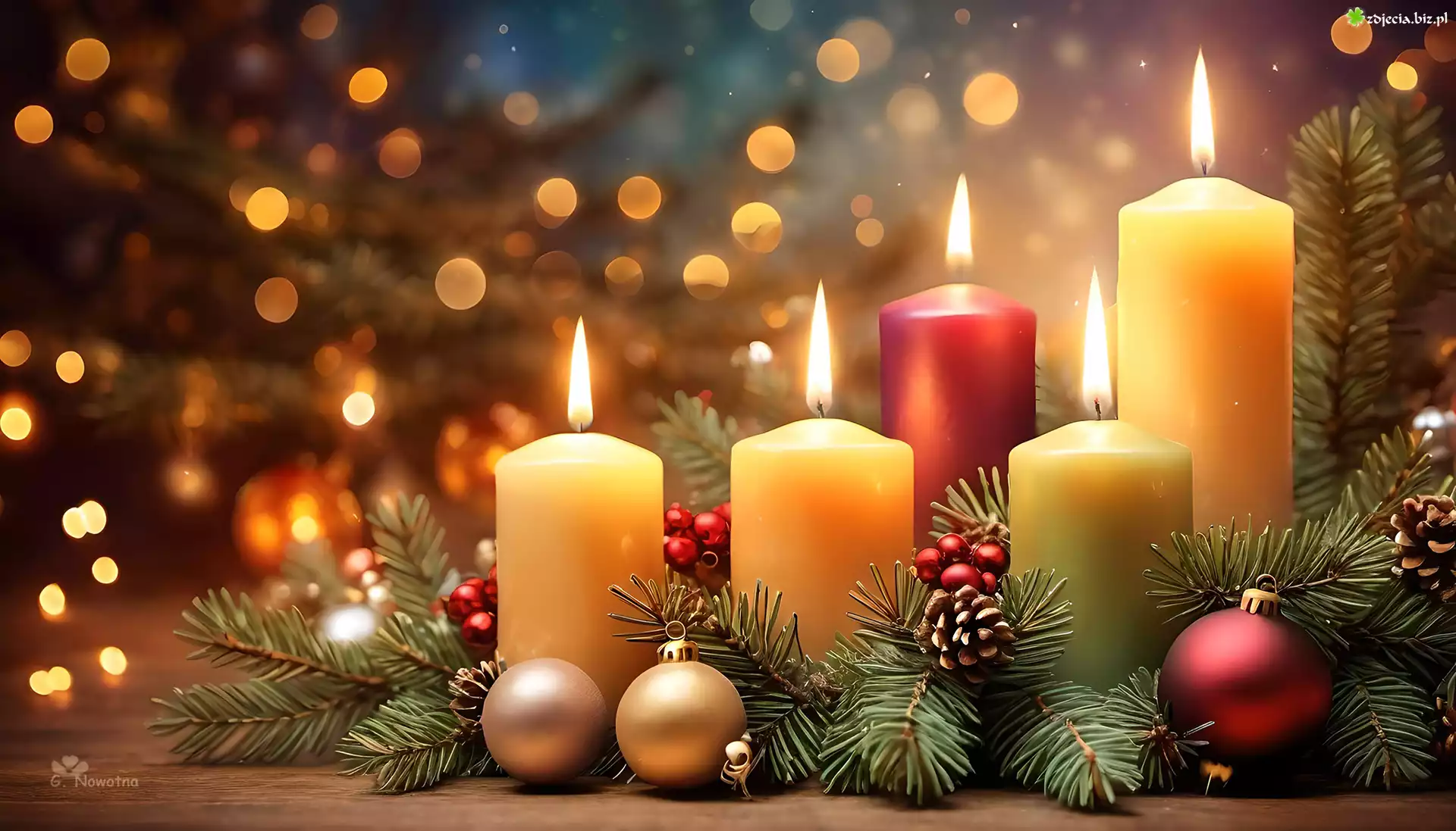 Zdjęcie Świece, Gałązki, Szyszki, Bombki, Stroik, Grafika, Boże Narodzenie