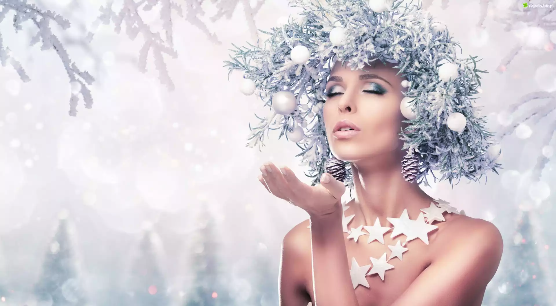Zdjęcie Kobieta, Naszyjnik, Gwiazdy, Świąteczny, Wianek, Gałązki, Rozmycie