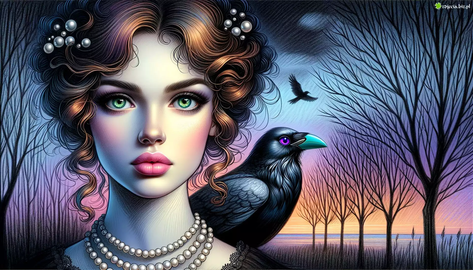Zdjęcie Kobieta, Naszyjnik, Perły, Kruk, Drzewa