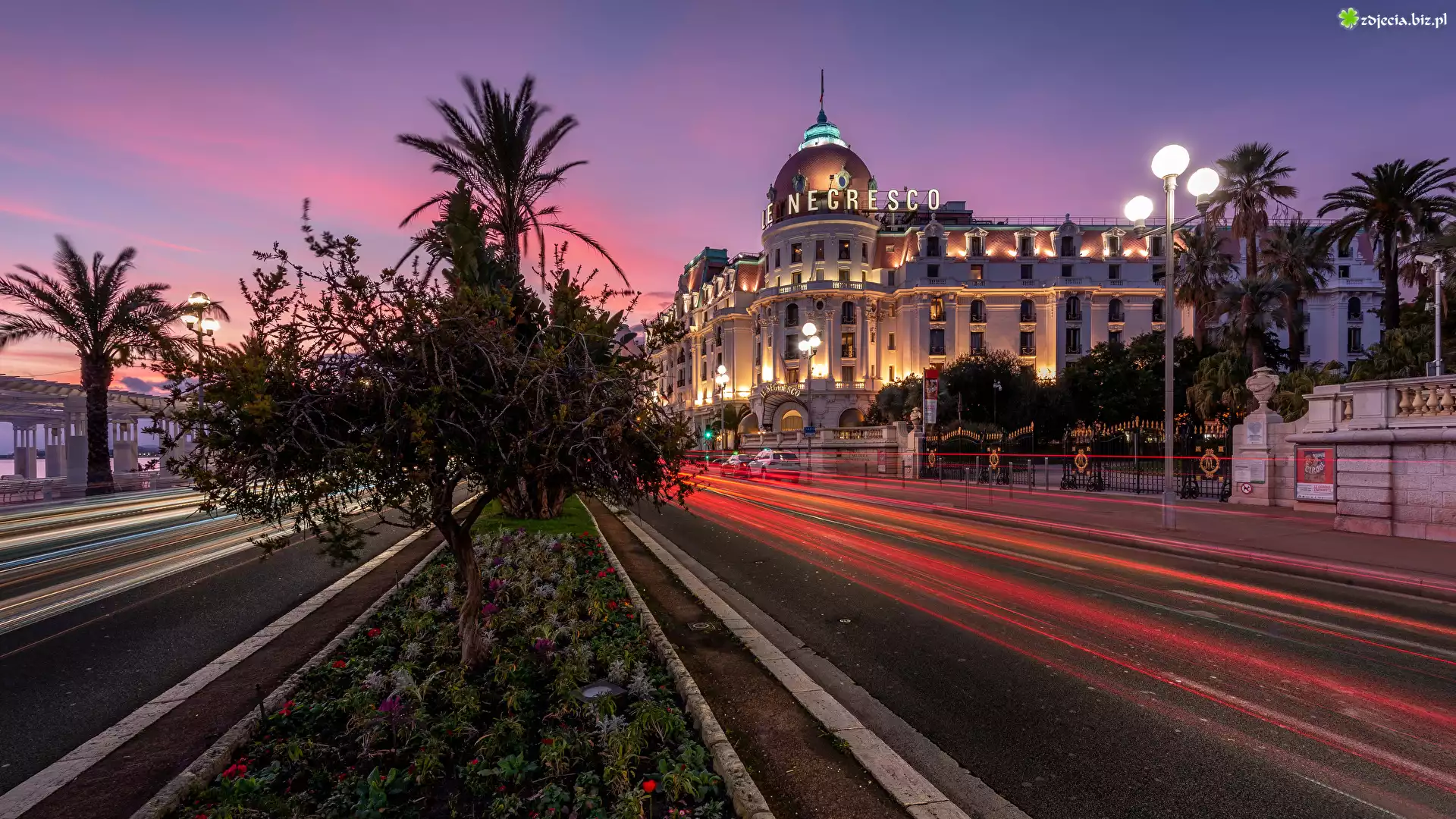 Zdjęcie Francja, Nicea, Noc, Ulica, Drzewa, Domy, Hotel Negresco
