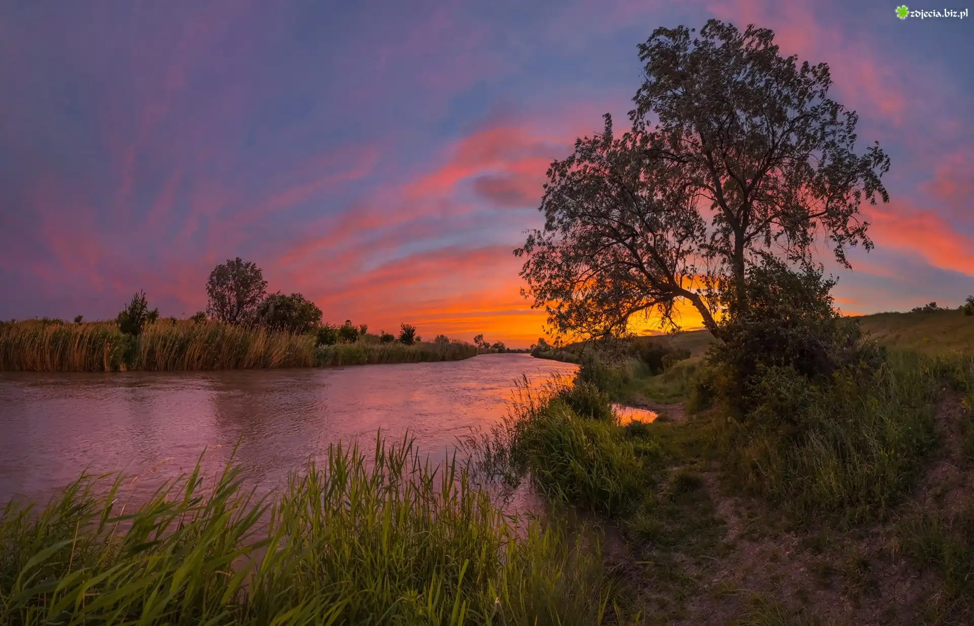 Zdjęcie Rzeka, Kanał Nevinnomyssk, Drzewa, Roślinność, Zachód słońca, Stawropol, Kraj Stawropolski, Rosja |
