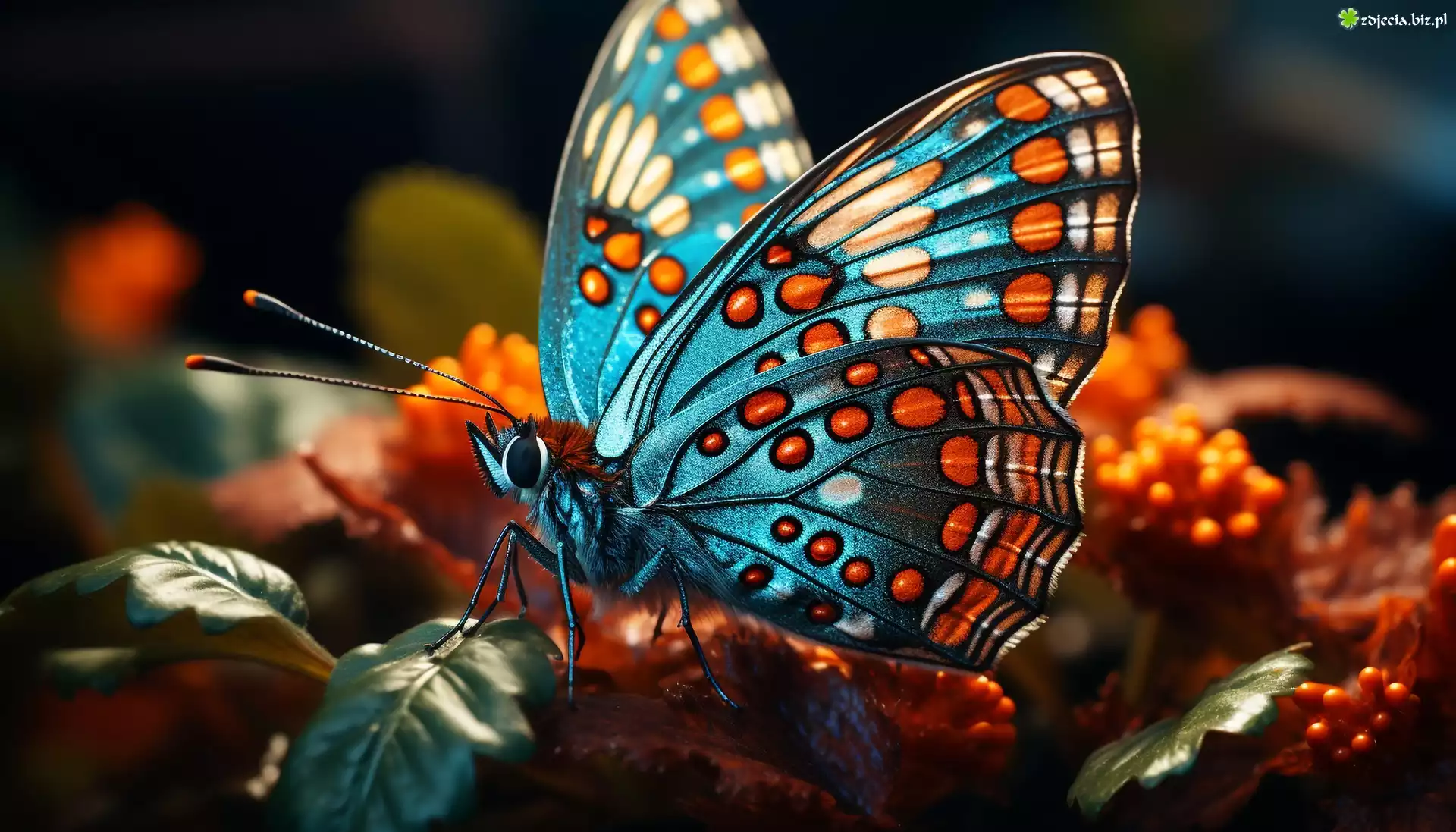 Zdjęcie Motyl, Niebieski, Kwiaty, Liście, Grafika