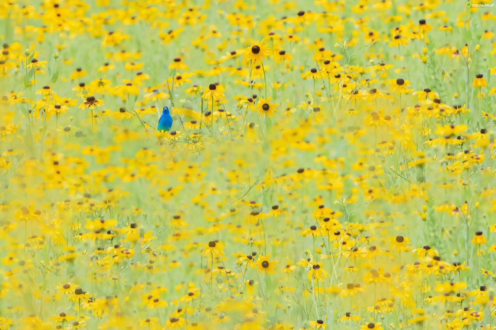 Zdjęcie Żółte, Kwiaty, Rudbekia, Niebieski, Ptak