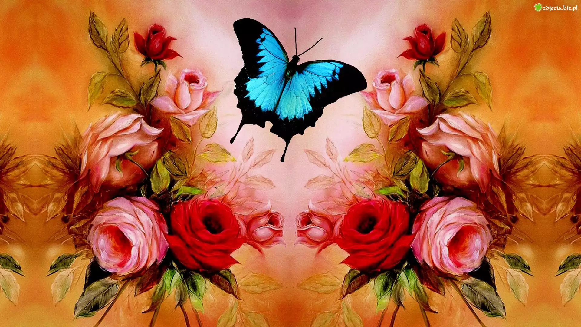 Zdjęcie Niebieski, Motyl, Rożowe, Czerwone, Róże, Obraz