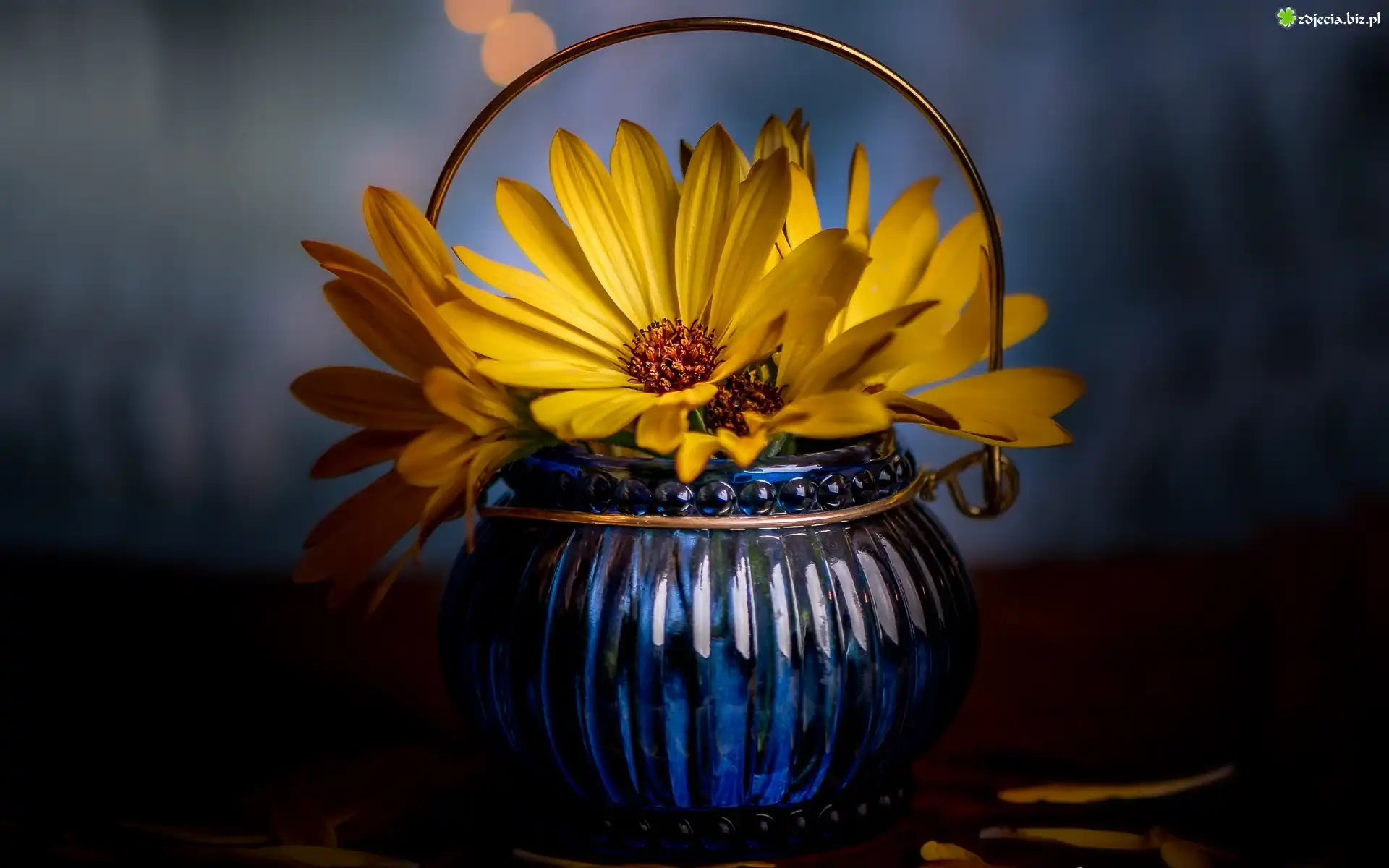 Zdjęcie Niebieski, Wazonik, Żółte, Kwiaty, Stokrotki afrykańskie