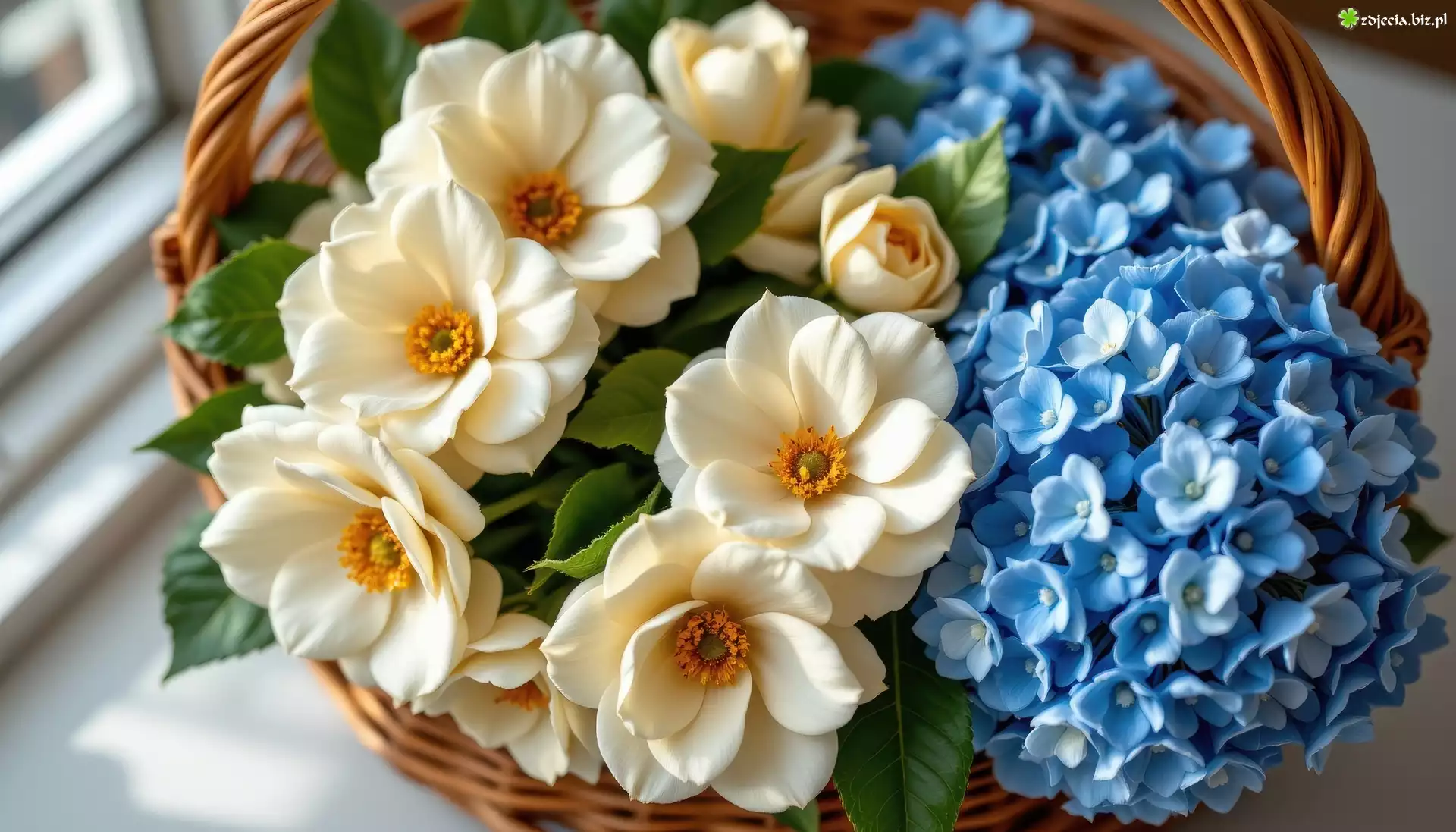 Zdjęcie Kwiaty, Kamelie, Hortensje, Niebieskie, Koszyk, AI