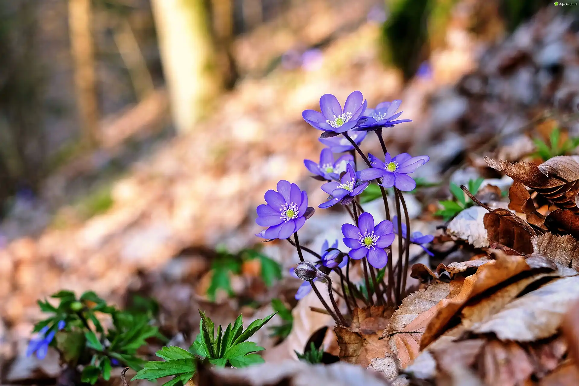 Zdjęcie Niebieskie, przylaszczki, Las, Liście, Drzewa, Wiosna