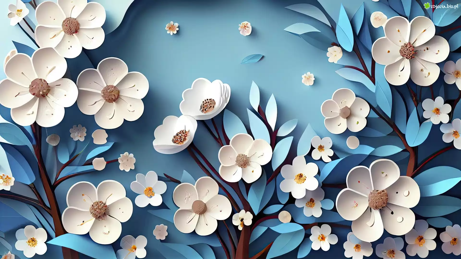 Zdjęcie Białe, Papierowe, Kwiaty, Niebieskie, Liście, Grafika