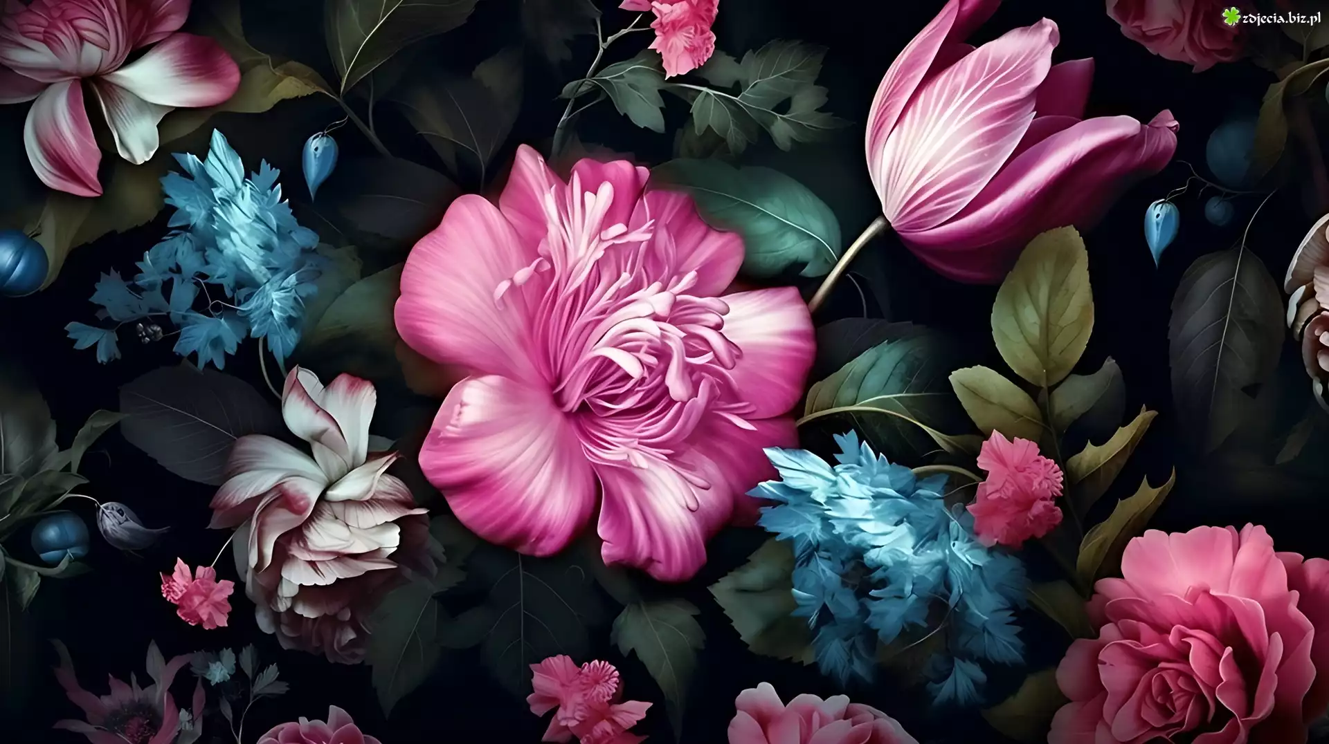 Zdjęcie Różowe, Niebieskie, Kwiaty, Listki, Grafika