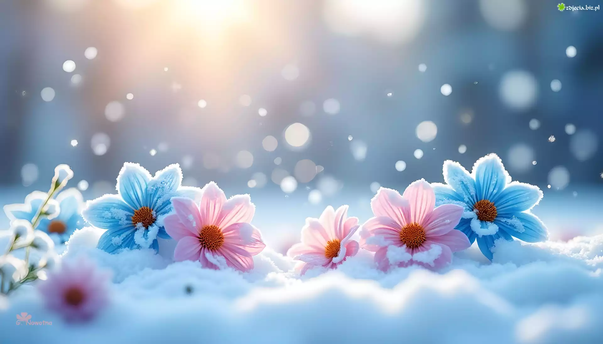 Zdjęcie Różowe, Niebieskie, Kwiaty, Śnieg, Grafika