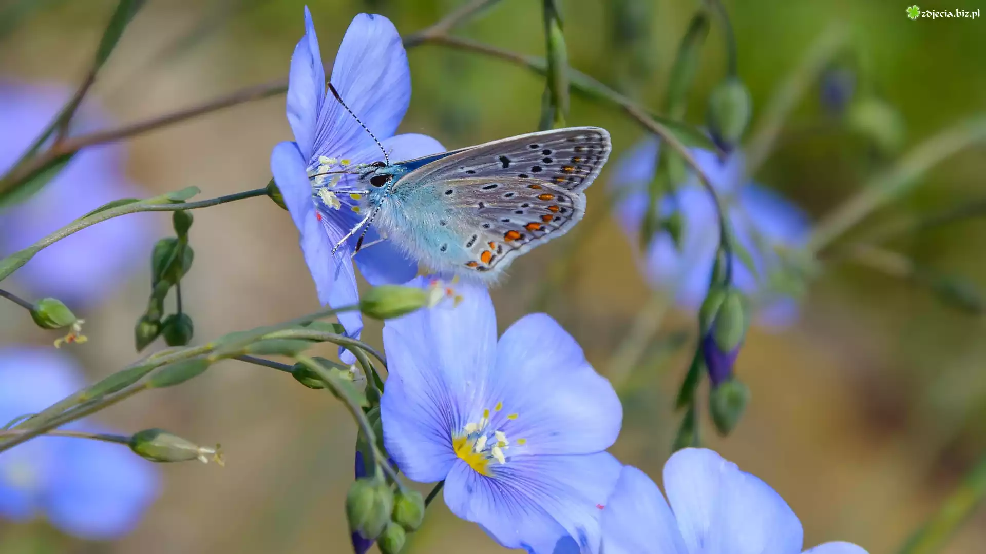 Zdjęcie Niebieskie, Kwiaty, Len, Motyl, Modraszek ikar