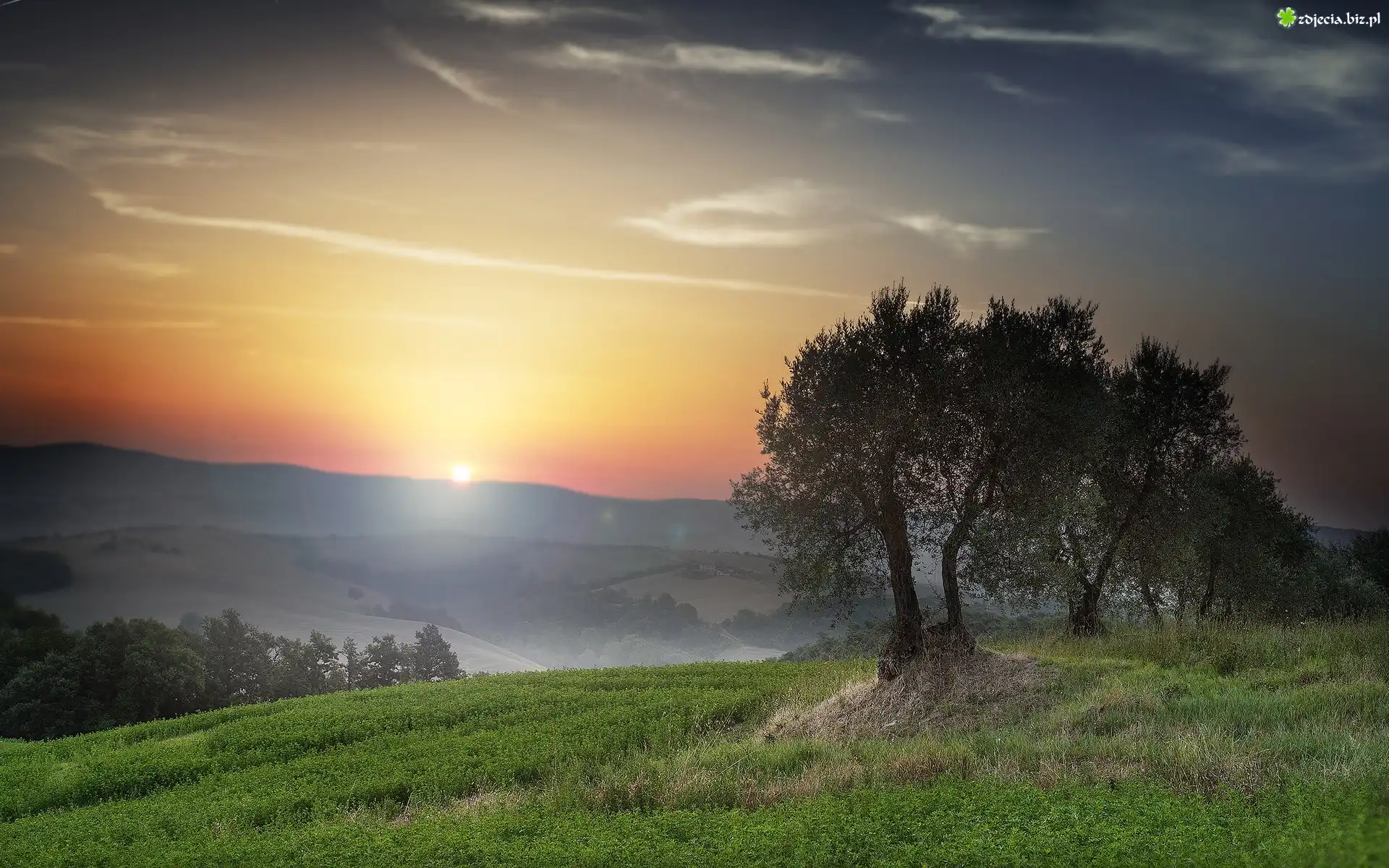 Zdjęcie, Niebo, Chmury, Zachod, Slonca, Drzewo, Laka
