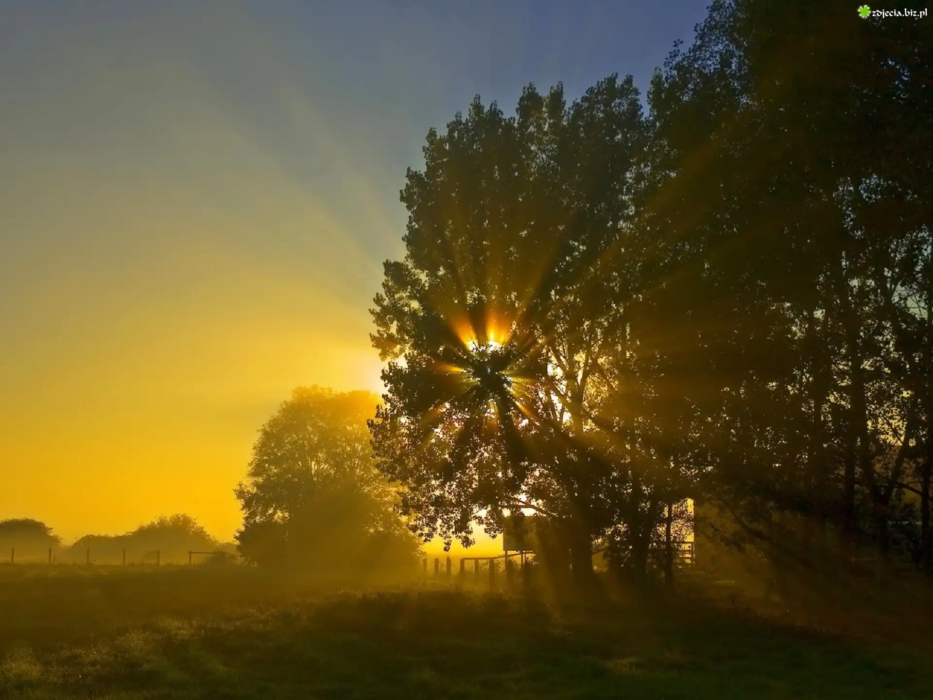 Zdjęcie Niebo, Zachód, Słońce, Drzewa, Las, Płot