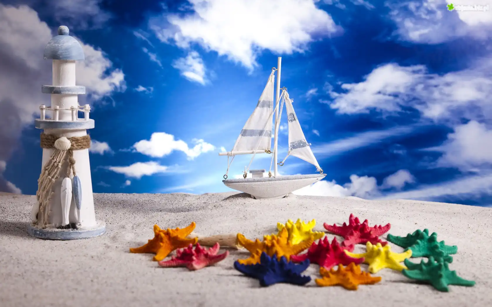 Zdjęcie Niebo, Stateczek, Plaża, Latarnia, Morska, Rozgwiazdy