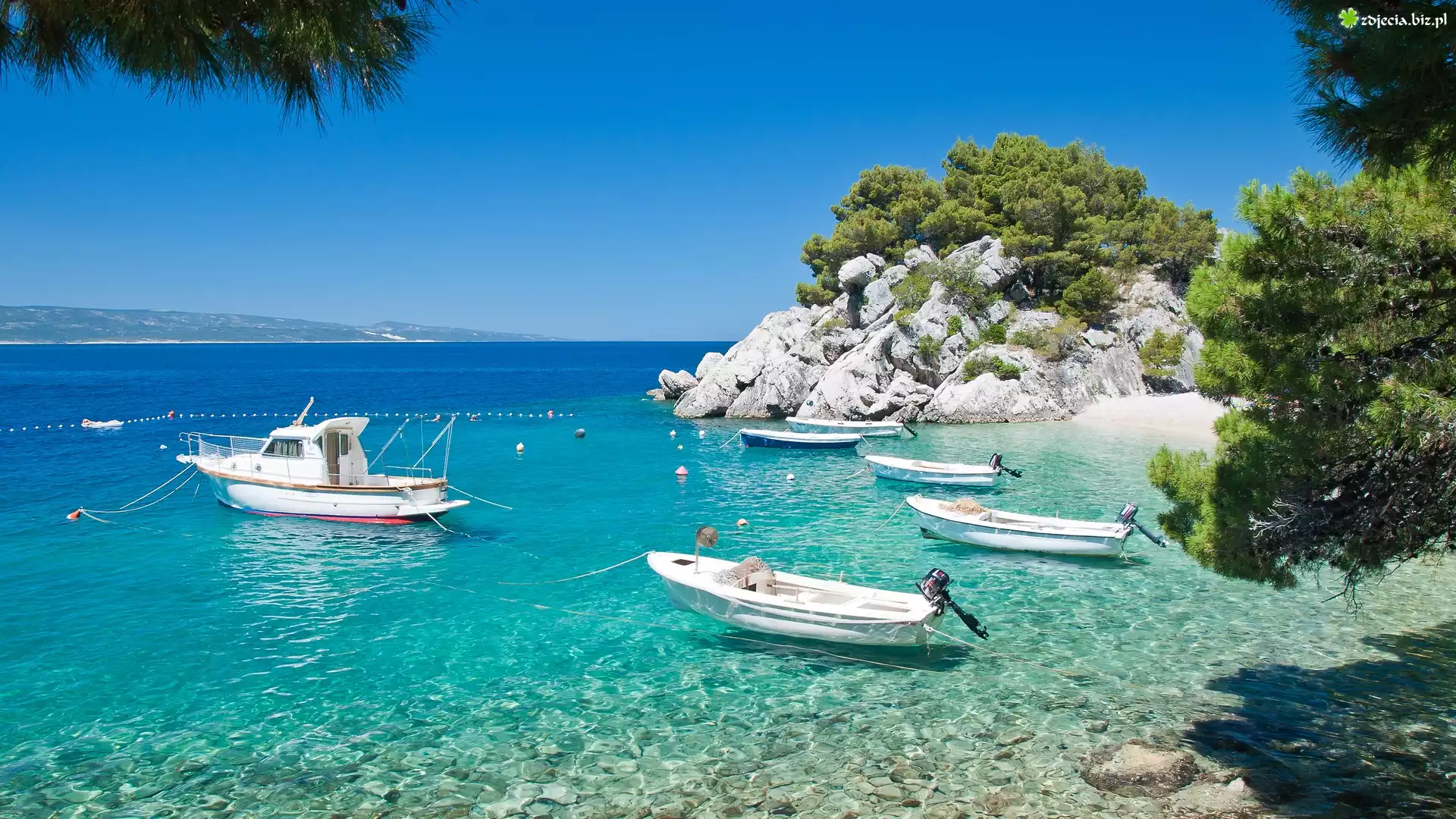 Zdjęcie Morze, Niebo, Jacht, Łodzie, Skała, Drzewa, Plaża