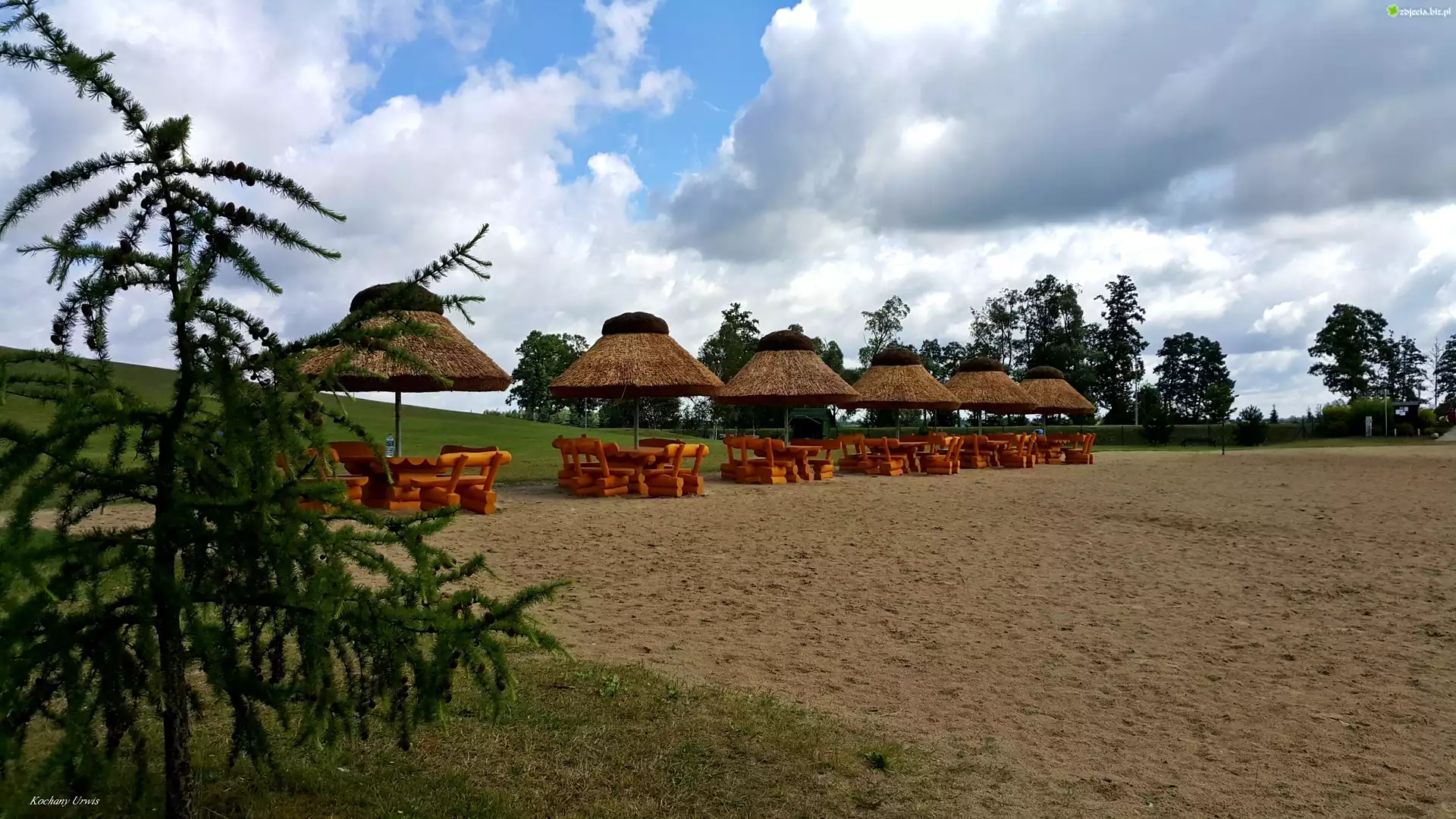 Zdjęcie Niebo, Chmury, Piasek, Drzewa, Parasole, Ławki
