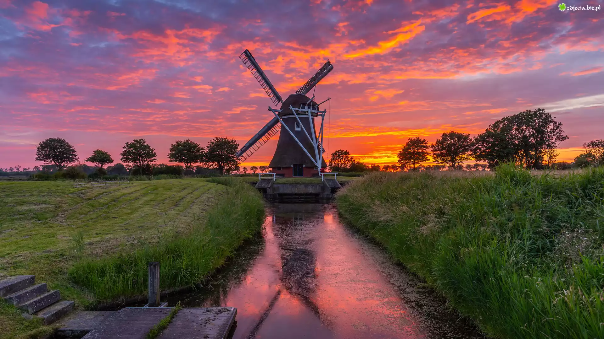 Zdjęcie Wiatrak, Rzeka, Pole, Niebo, Zachód słońca, Drzewa