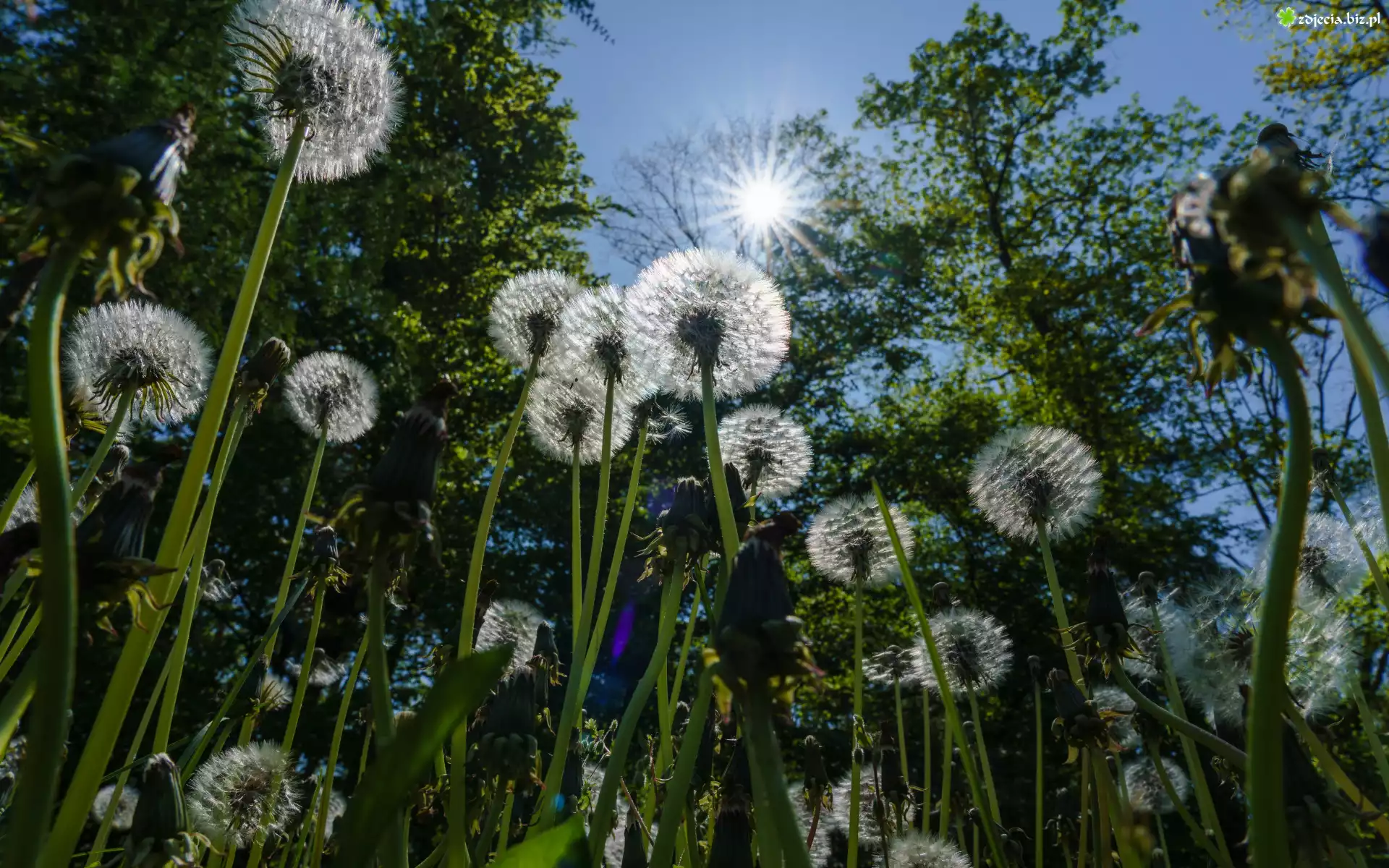 Zdjęcie Drzewa, Kwiaty, Dmuchawce, Niebo, Promienie słońca