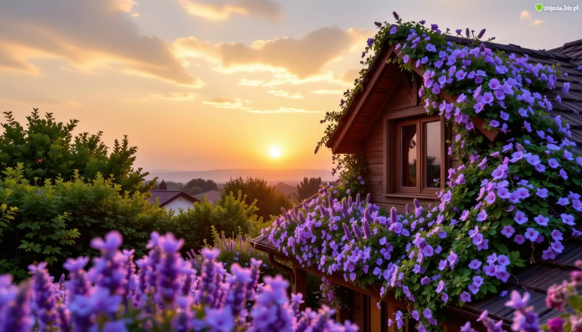 Zdjęcie Domy, Kwiaty, Drzewa, Niebo, Zachód słońca