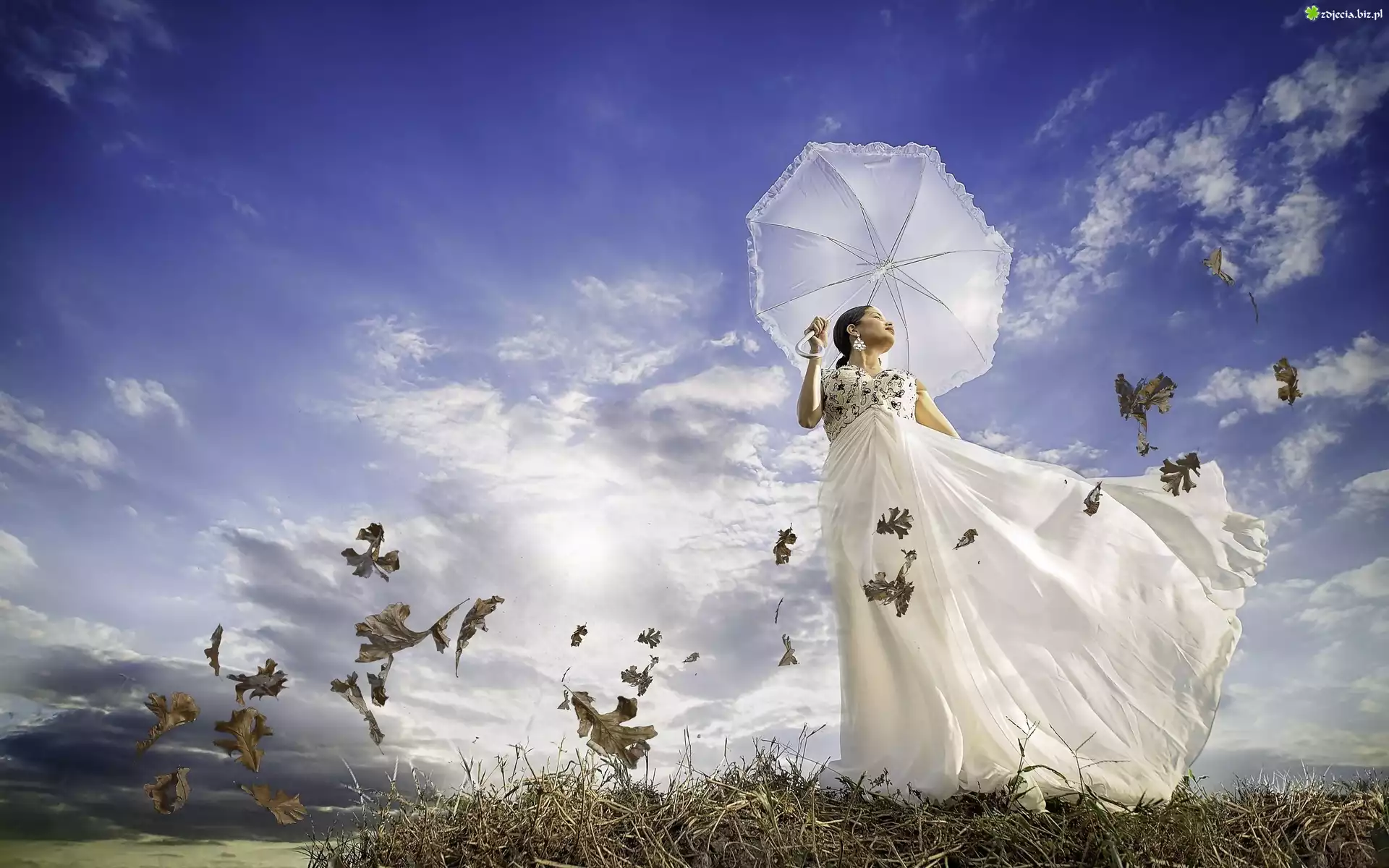 Zdjęcie Niebo, Chmury, Kobieta, Parasolka, Wiatr, Liście