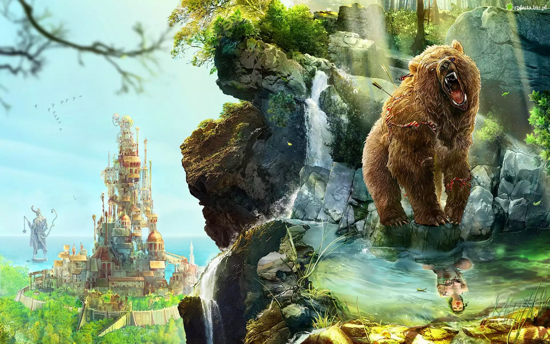 Zdjęcie Ryczący, Niedźwiedź, Odbicie, Kobieta, Skały, Zamek, Fantasy