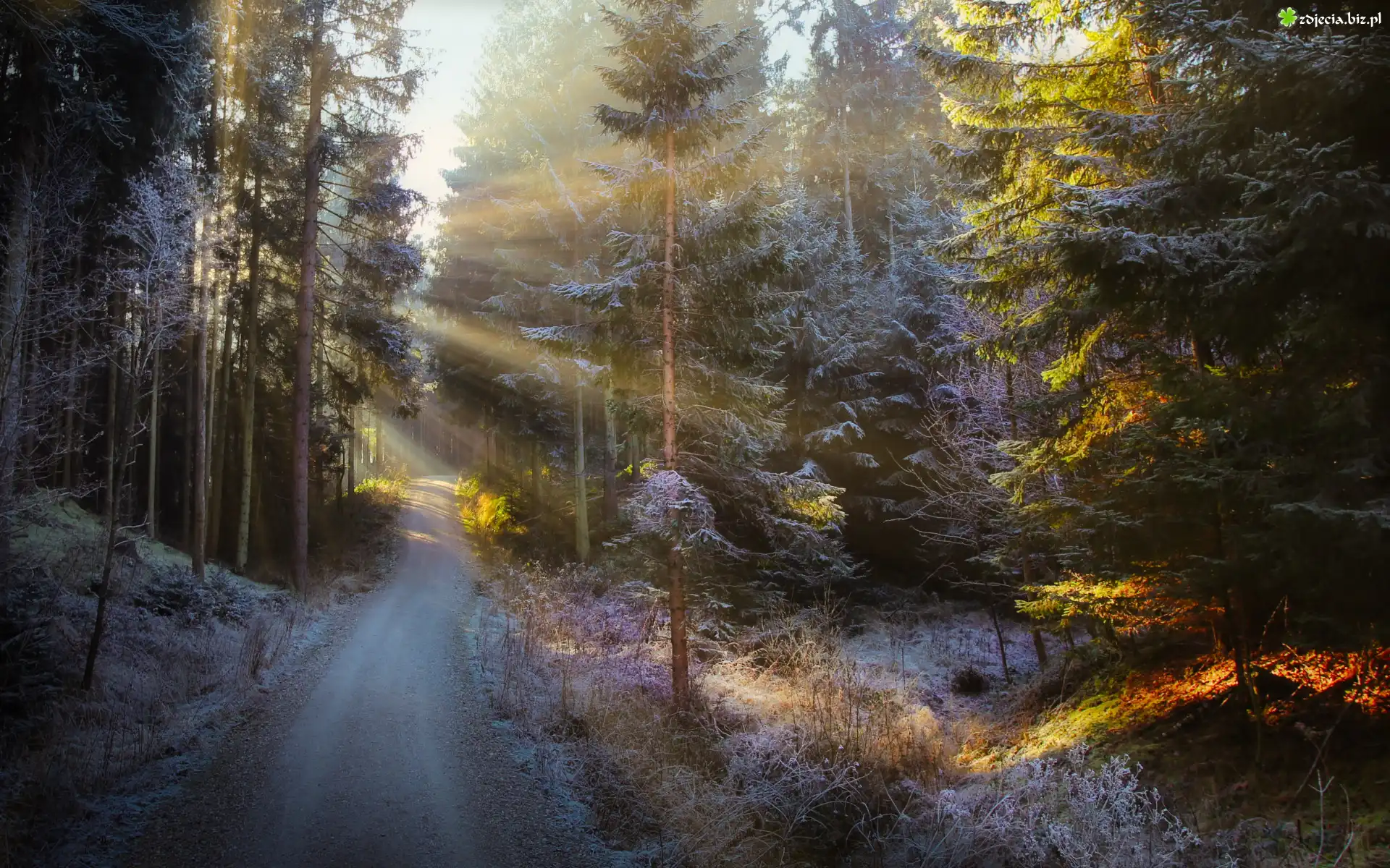 Zdjęcie Śnieg, Droga, Las, Drzewa, Przebijające światło