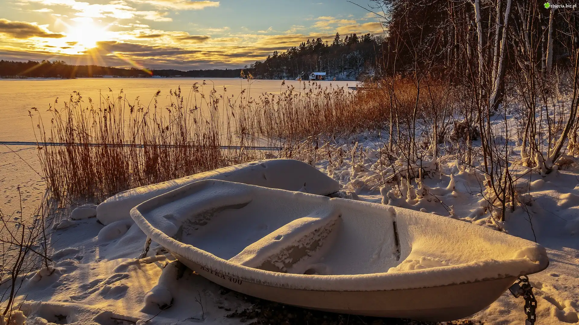 Zdjęcie, Zima, Śnieg, Zachód słońca, Jezioro, Łódki, Drzewa, Szuwary