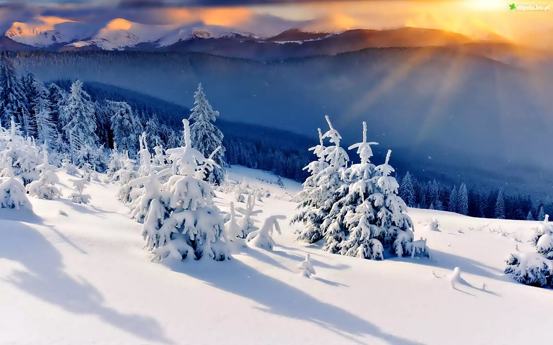 Zdjęcie Zima, Śnieg, Drzewa, Góry, Zachód Słońca, Dolina